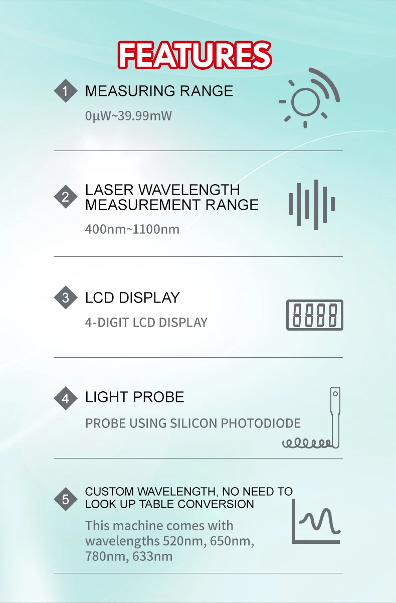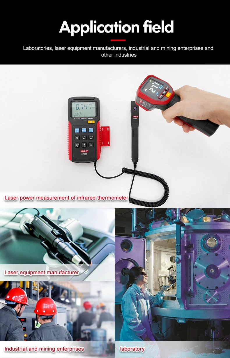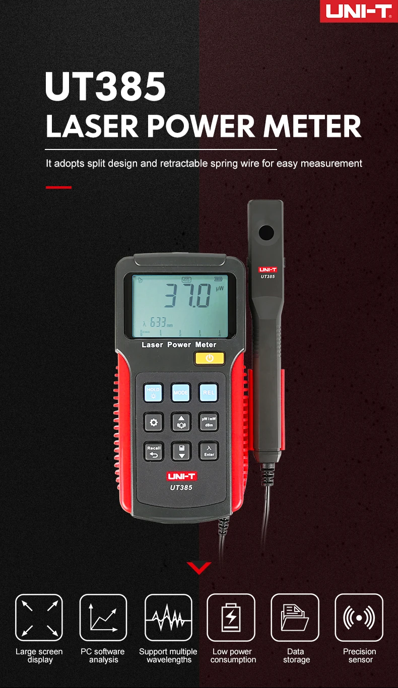 UT385 лазерный измеритель мощности используется для измерения выходной энергии лазерных лучей для тестирования или применения лазерной системы. Он использует датчик обнаружения для определения интенсивности выхода энергии лазерного луча.