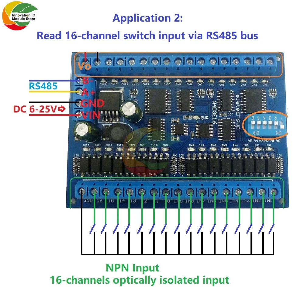 6: 16-входной канал может удаленно Управляйте 16-канальный выход другого доска через RS485 автобус (соответствующие регистрирует должны быть установлены на основании)