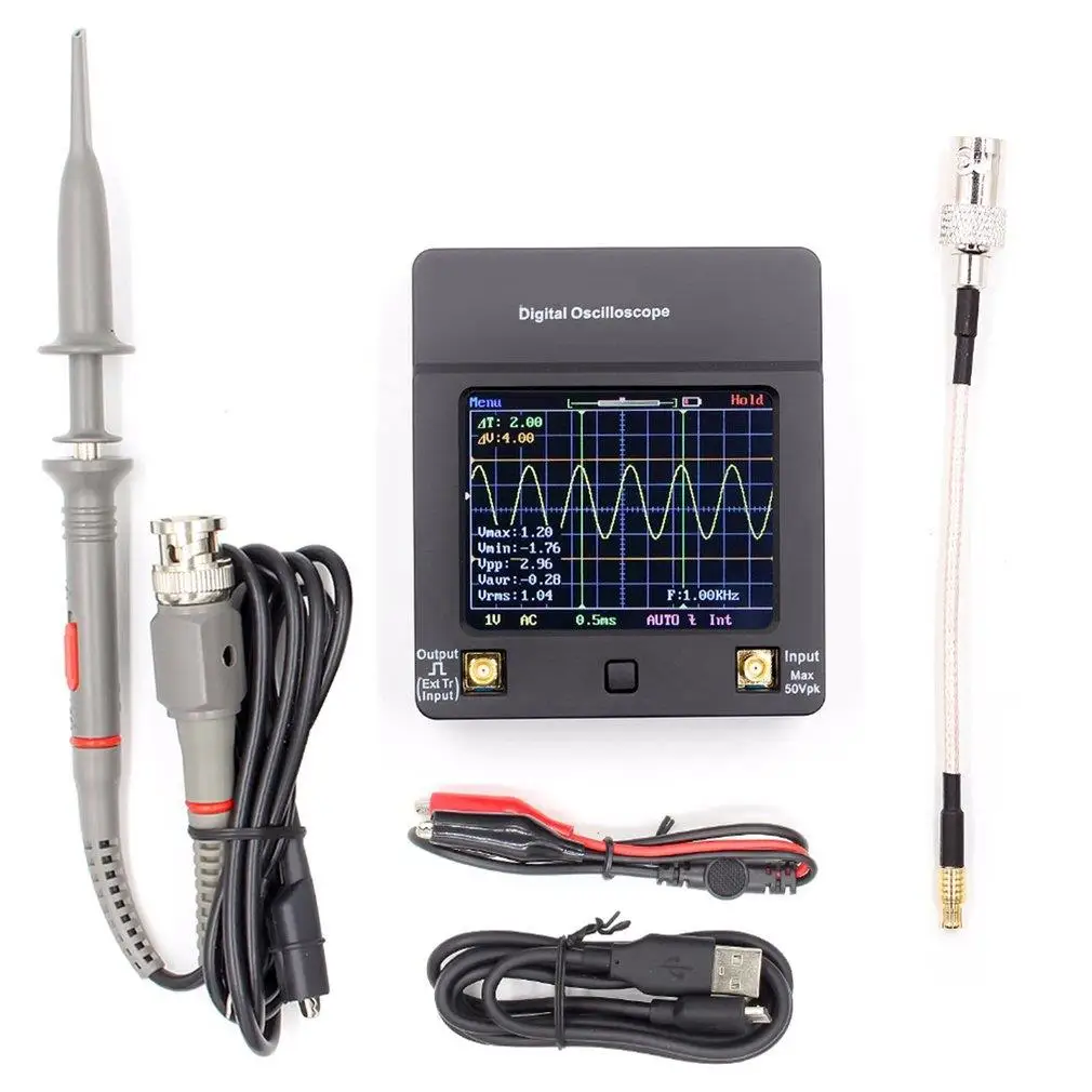 Особенности: 1. Карманный осциллограф с цветным дисплеем и сенсорной панелью. 2. Аналоговая полоса пропускания 2 МГц и максимальная частота дискретизации 5 Msps в реальном времени. 3. Уникальный скользящий дисплей медленного сигнала для полностью непрерывного сигнала (режим сканирования вызовет перебои отображения сигнала). 4. Вертикальная чувствительность: 2 мВ/див, с высокой точностью и низким шумом, сохраняет 24 группы заданных параметров, удобно сохраняет и запоминает сигнал. 5. Измерение частоты и Макс./мин./Vpp/Avg. Значения напряжения. 6. Добавляет функцию внешнего запуска, более высокую способность захвата сигнала 7. Персональные данные о загрузке сигналов. 8. Замораживание в любое время отображения формы волны (функция удержания). 9. Квадратный волновой тестовый сигнал приходит 1000 Гц/3,3 В. 10. Обновление прошивки через Micro USB. 11. Питание от аккумулятора/USB, встроенное умное зарядное устройство. Описание: 1. DSO112A-это отличный осциллограф входного уровня с размером, который подходит прямо в руке и кармане. 2. Высокая чувствительность (2МВ/див), высокая точность и низкие шумы являются основным моментом DSO112A и делают его полезным инструментом для небольшого зондирования сигнала. Характеристики: Модель:DSO112A Полоса пропускания аналоговой частоты: 0 - 2 МГц Макс. Частота дискретизации в реальном времени: 5 Msps Вертикальная чувствительность: 2 мВ/Div-20V/див, 12 класс s (путем прогрессивного 1-2-5) Горизонтальный диапазон времени: 1 мкс/Div-50s/див, 21 класс (путем прогрессивного 1-2-5) Макс. Входное напряжение: 50Vpk (100Vpp) Макс. Длина записи: 512/1024 опционально Входное сопротивление: 1 м ом Точность ADC: 8 бит Метод соединения: DC / AC Тип триггера: автоматический, нормальный, одиночный Кромка триггера: подъем/опускание Источник запуска: внутренний/внешний Напряжение внешнего триггера: 0-15 в Курсоры времени: Автоматическое вычисление и отображение разницы во времени Курсоры напряжения: автоматически рассчитать и отобразить разницу в напряжении Дисплей: цветной дисплей TFT Мощность питания: 3,7 V, 1200 мА/ч, литий-ионный аккумулятор (все указанные аккумуляторы входят в комплект поставки), USB Интерфейс Размеры: 68x78x18 мм (2,7x3,1x0,7 дюйма) Посылка включает в себя: 1 * осциллограф 1 * Датчик зажима осциллографа