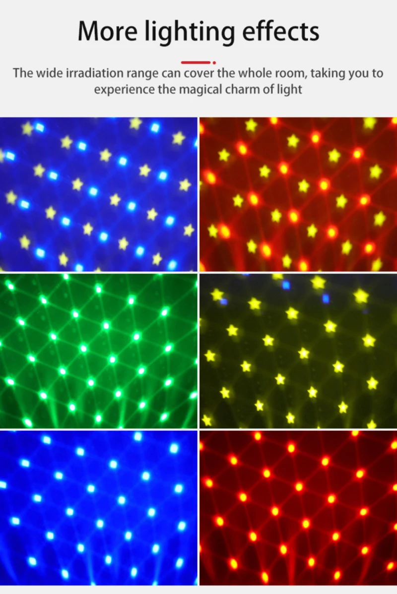 【RGB цветной фоновый светильник + RG Лазерный светильник Beams】 лазерный светильник светодиодный светильник источник (красный, зеленый, синий и желтый), произведенный RGB 4 цвета светодиодный светильник. 18 режимов освещения, четыре фантастических звездных узора. Создайте фантастическую атмосферу, объединив их эффекты или включите их независимо, как вам нравится.