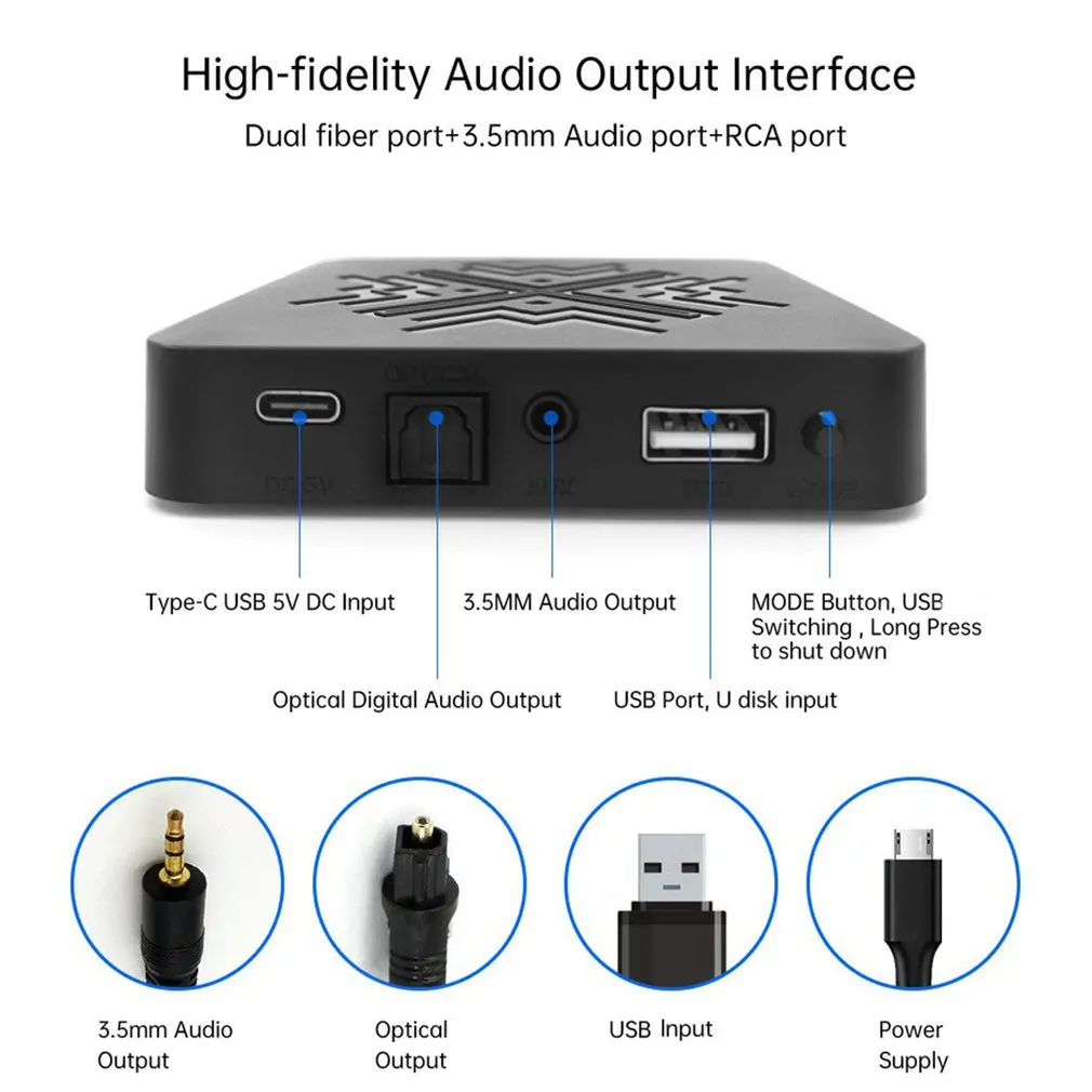 1. Функция: Этот аудио приемник является беспроводным аудио приемником с двойным интерфейсом аудиовыхода. Он соединяет ваш дом или автомобильные динамики через 3,5 мм aux или оптический цифровой аудио выход, и легко превращает ваш обычный динамик в беспроводной динамик.