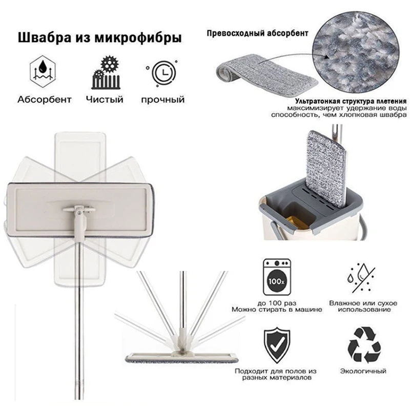 Комплект для уборки, в который входят швабра и ведро с отжимом и полосканием. С этим комплектом вы полюбите уборку! Благодаря ведру со специальной крышкой вы с легкостью вымоете и выжмете тряпку, не прикасаясь к ней руками и не снимая ее со швабры. Также в комплект входят две насадки для швабры из микрофибры. Микрофибра на швабре буквально притягивает к себе всю пыль, грязь и песок с поверхностей. Ручка с регулируемой длинной состоит из нескольких частей, которые легко собрать и разобрать. В разобранном положении швабра занимает меньше места. Инструмент выполнен из металла и прочного пластика и прослужит вам долго. Подвижная головка швабры позволит вымыть пол под кроватью, шкафом или другом труднодоступном месте. Отлично подходит для линолеума, деревянных полов, ламинатов, полов из плитки и других поверхностей.