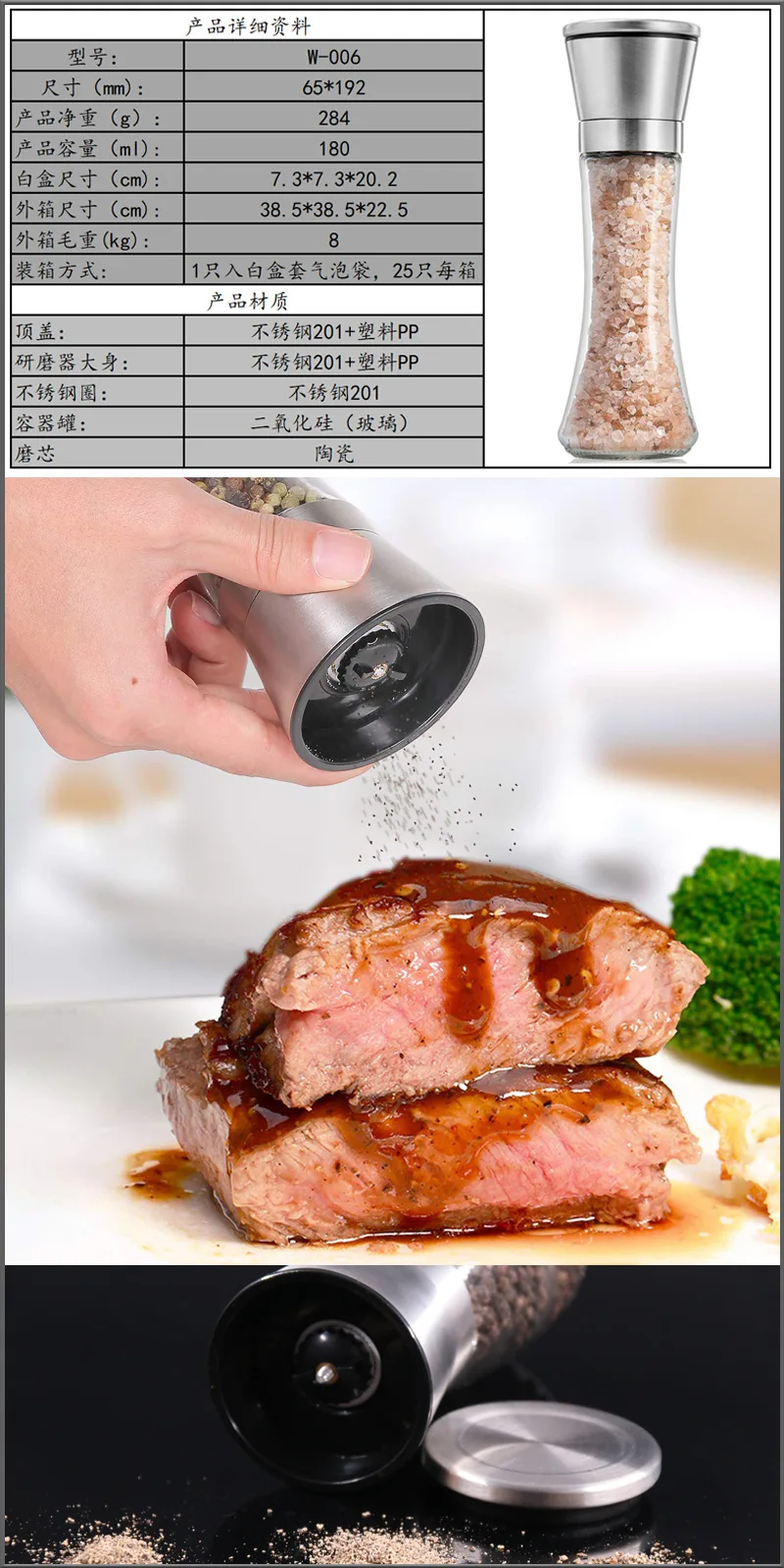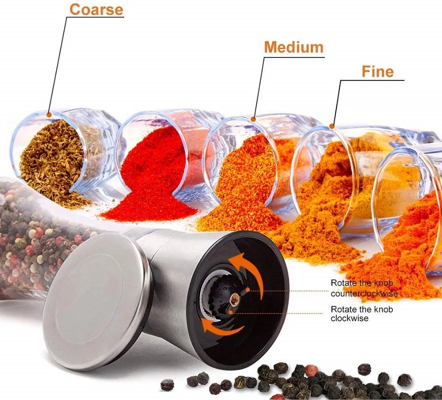 Stainless Steel Pepper Grinder-Convenience -slim and graceful -fashion.The grinders measure 7.5" tall by 2.1" wide and they have a 3/4 cup capacity to hold your perfect for all types of fresh spices. Can be used for a long time.