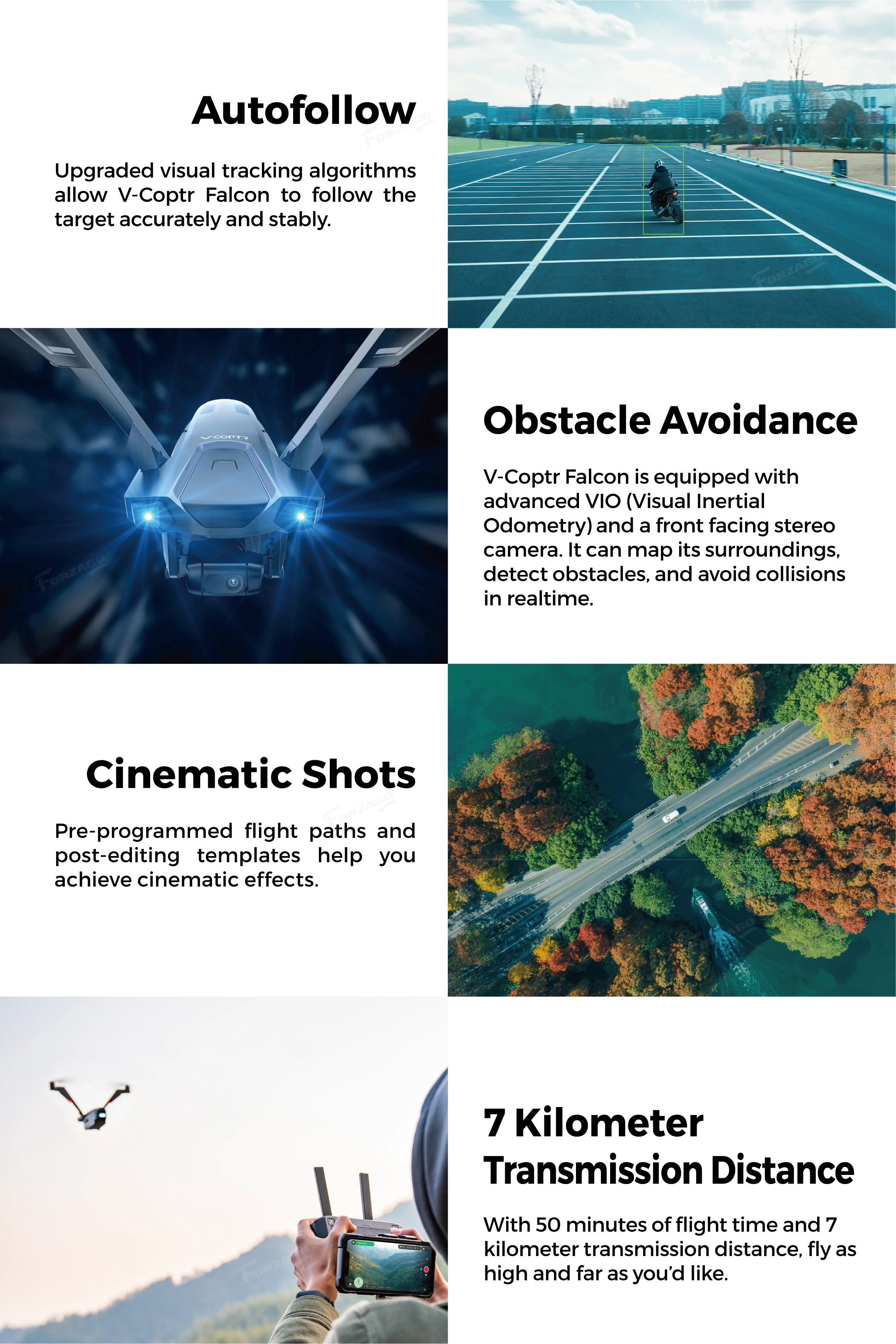 【Autofollow】: усовершенствованные алгоритмы визуального отслеживания позволяют V-Coptr FalconTТочно и стабильно Следуйте цели.