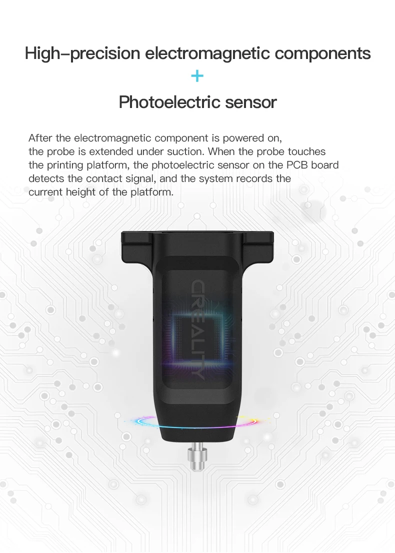 CR Touch, который специально разработан для 3D-принтера датчик для автоматического выравнивания кровати компанией CREALITY, по сравнению с традиционным автоматическим выравниванием. Он совместим с большим количеством платформ для 3D-принтеров, более стабильным и cost-effective.CR касание Обновлено до металлического щупа, что уменьшает износ и значительно продлевает срок службы.