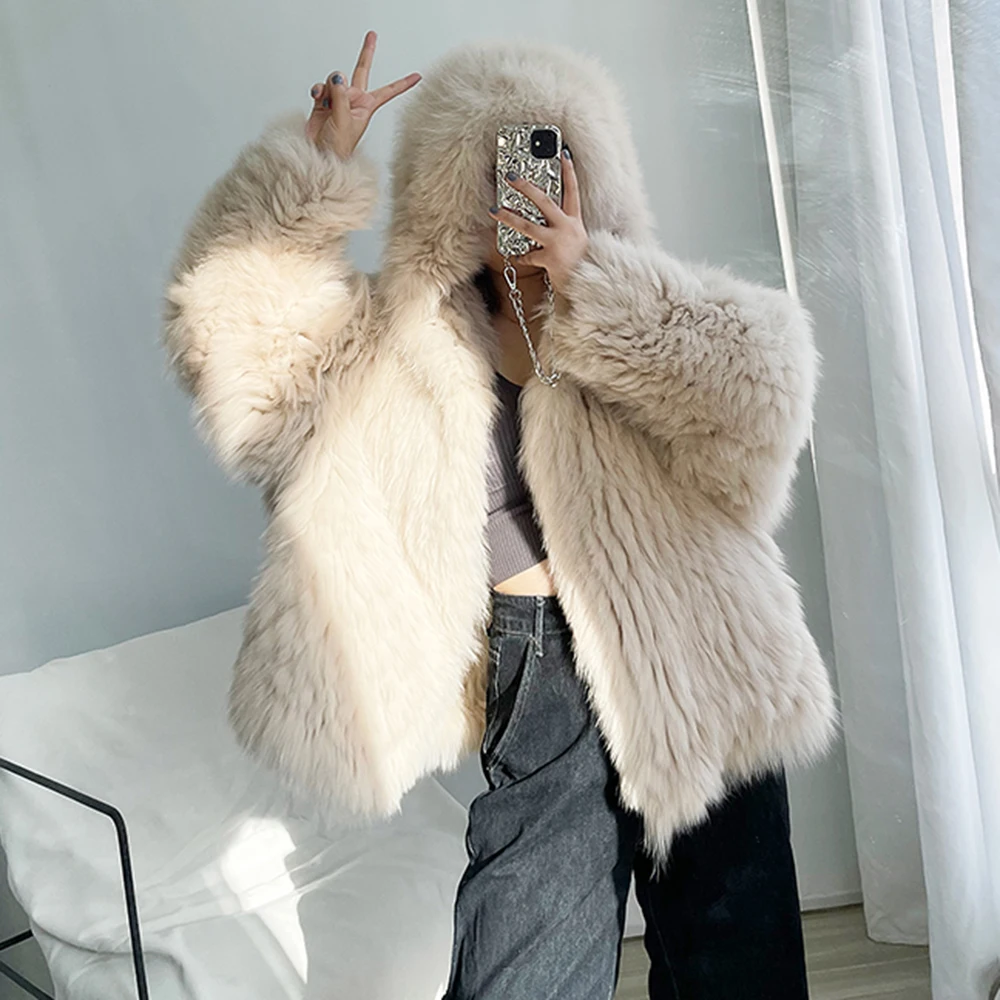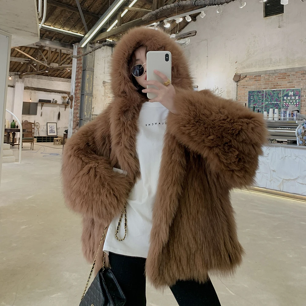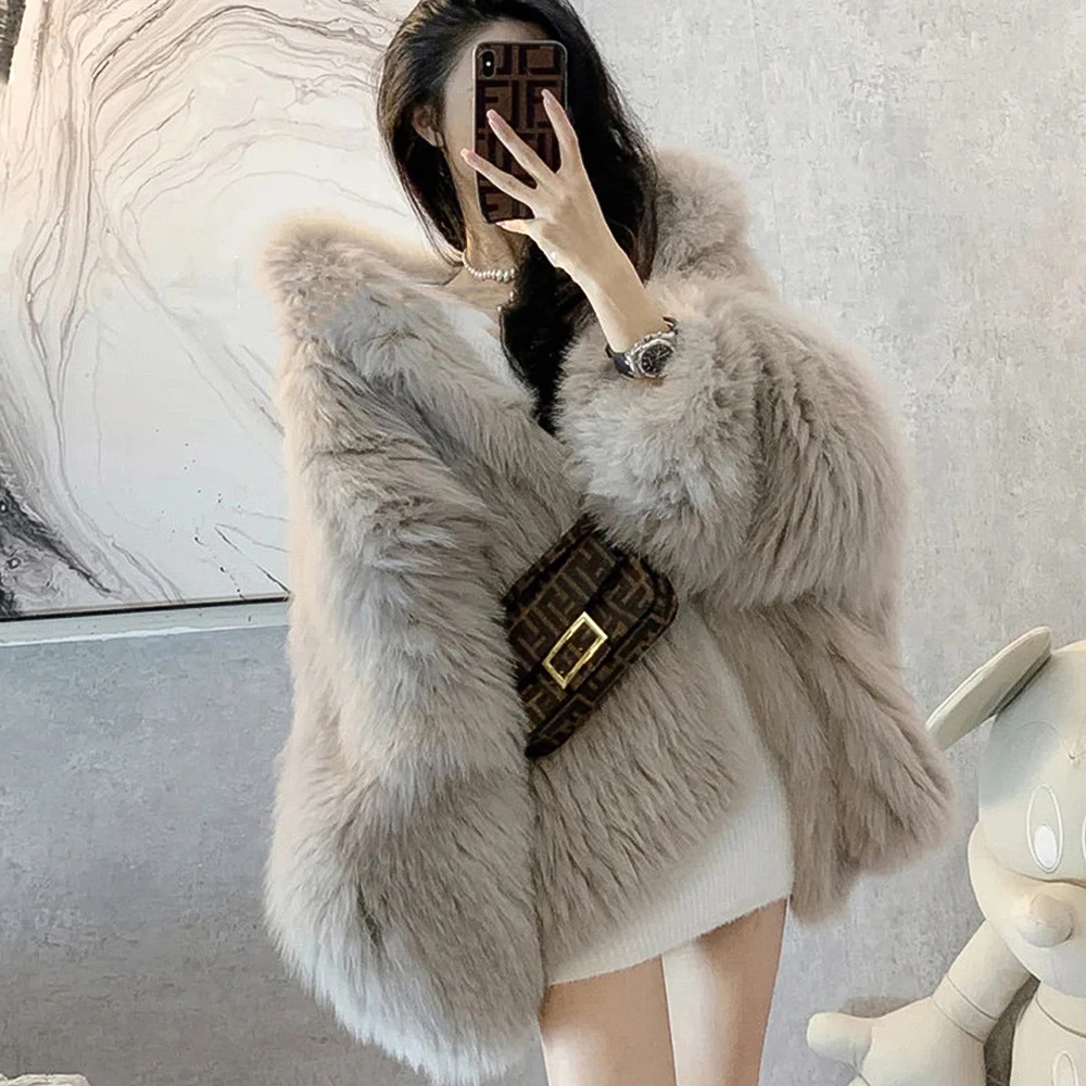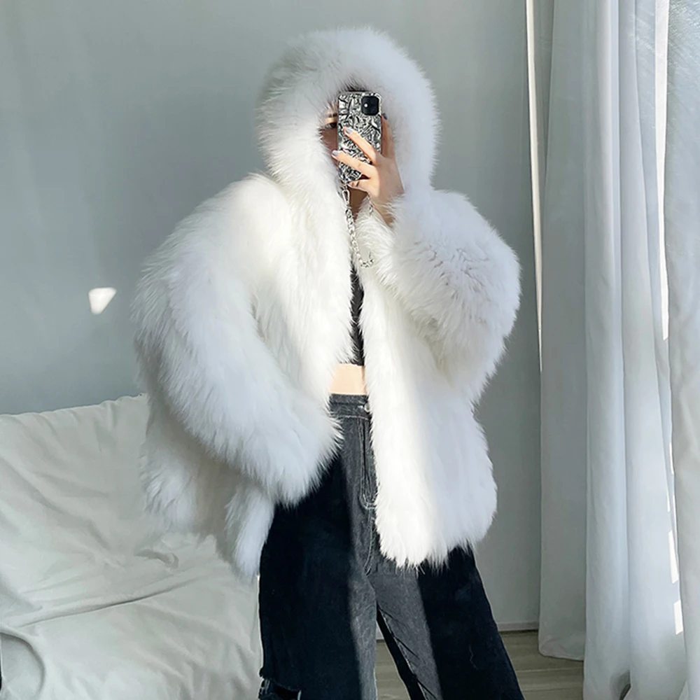 Высококачественное роскошное пальто из искусственного меха, женская Свободная куртка с капюшоном и лисьим мехом, Модное теплое плотное пальто, зимняя пушистая Меховая куртка для девочек