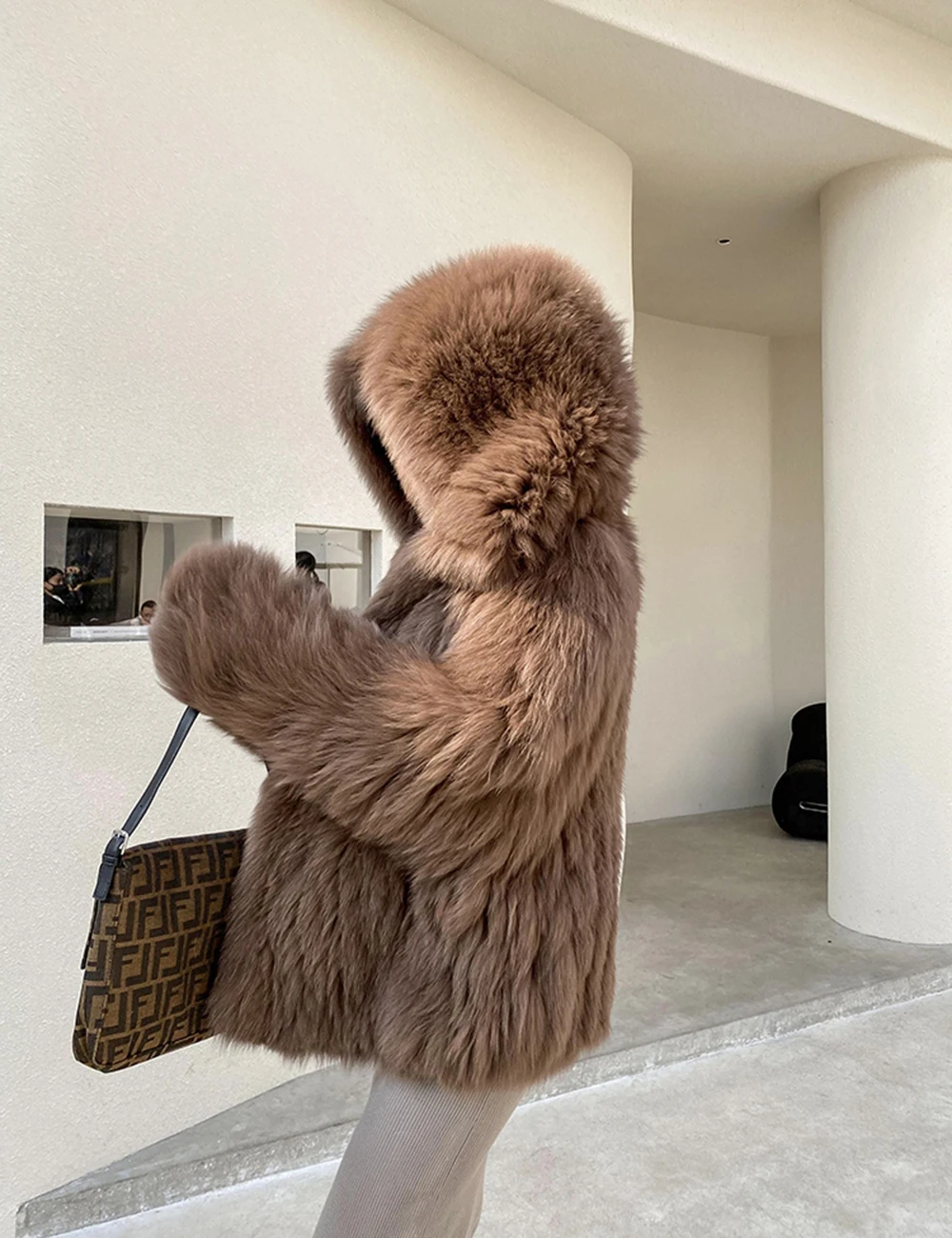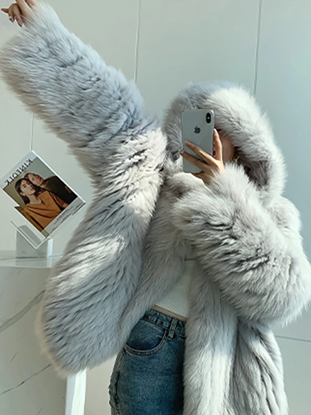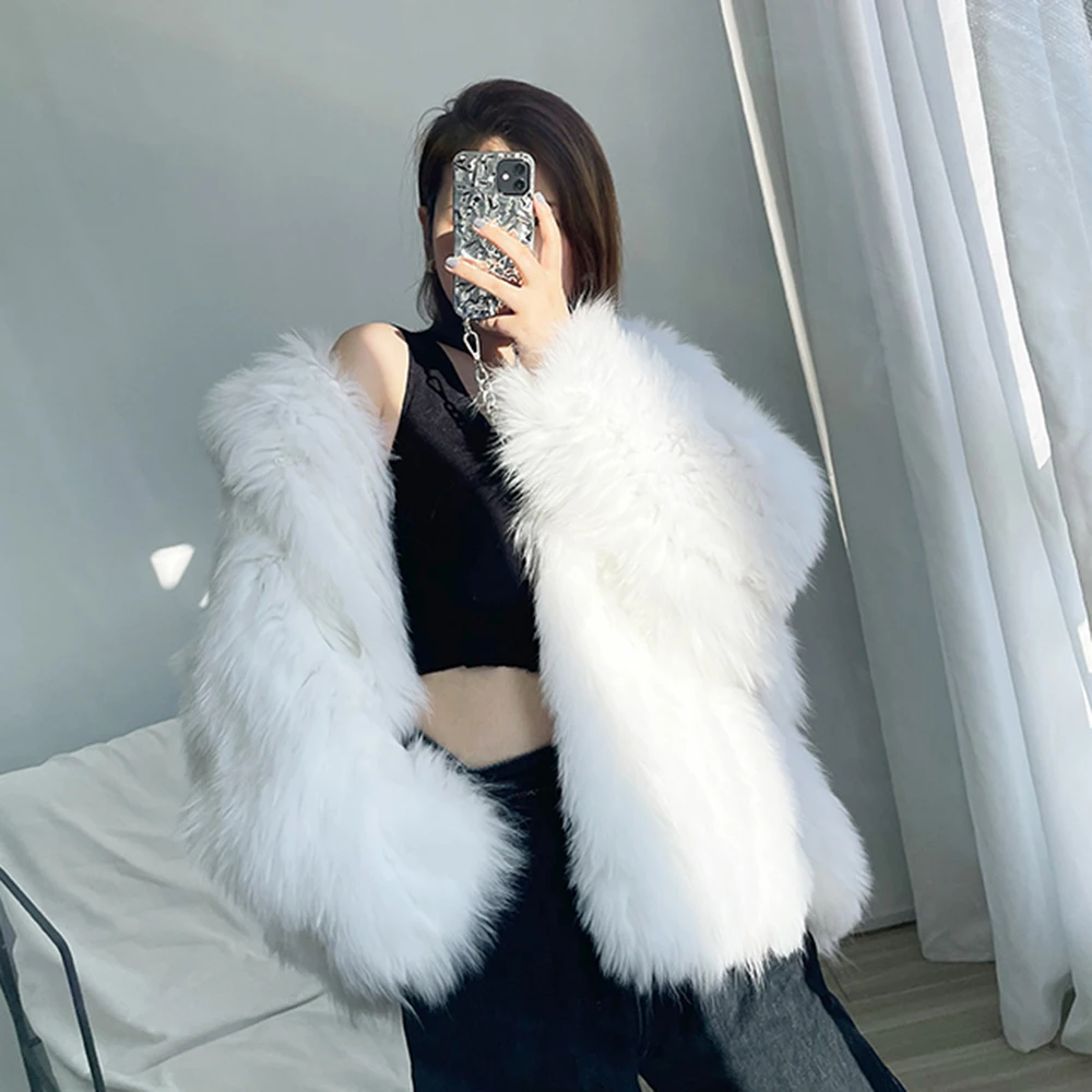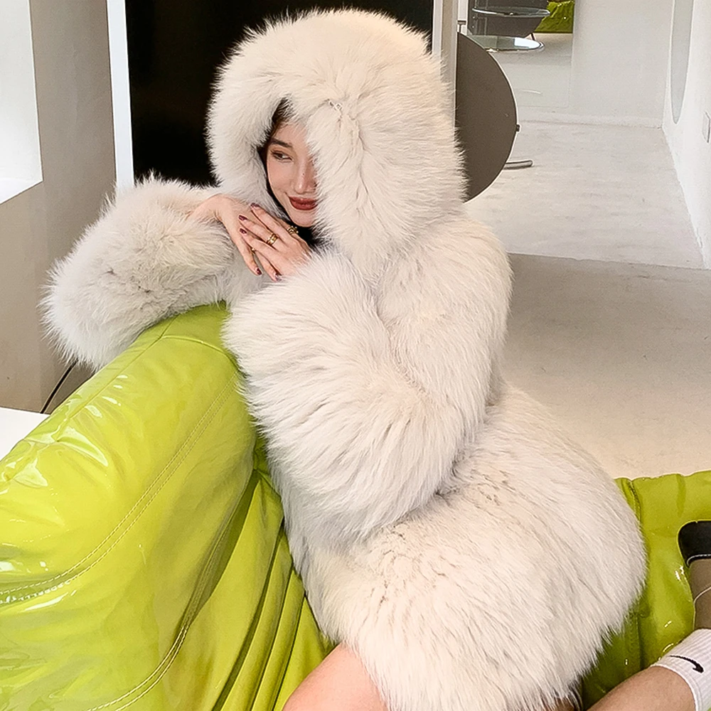 Высококачественное роскошное пальто из искусственного меха, женская Свободная куртка с капюшоном и лисьим мехом, Модное теплое плотное пальто, зимняя пушистая Меховая куртка для девочек