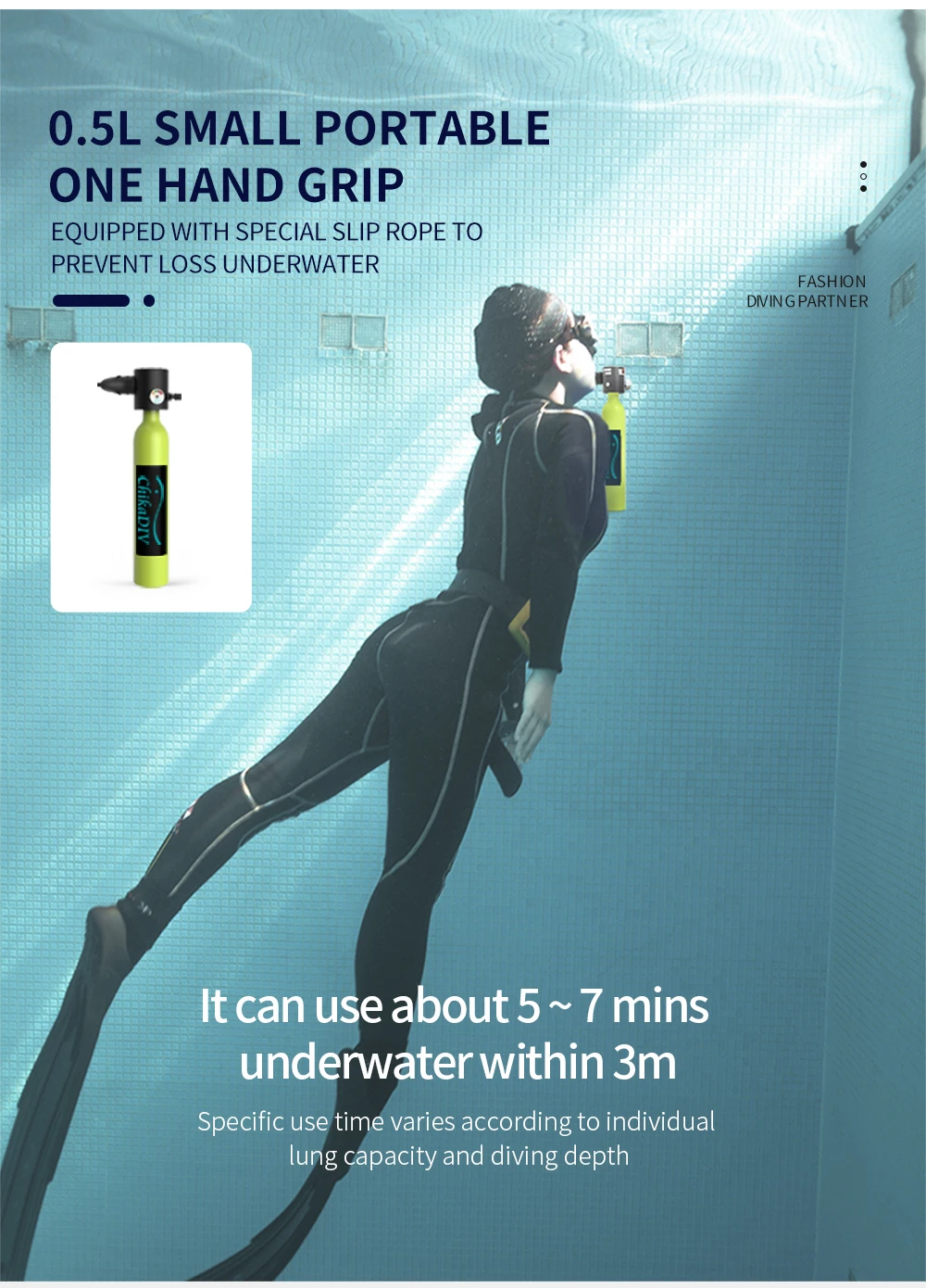 1. Кислородный баллон 0,5л позволяет ныряльщику оставаться (в пределах) 10 метров под водой в течение 5-10 минут (в зависимости от индивидуальной емкости легких и глубины погружения), идеально подходит для начинающих.