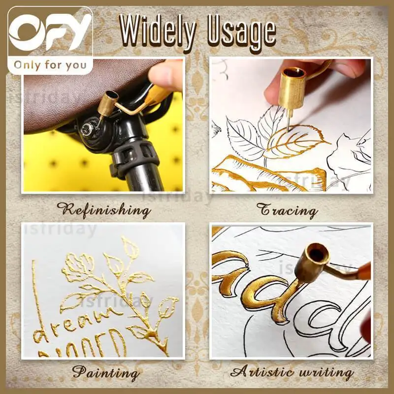 The OFY® Slanting Fine Line Paint Pen is used as an artistic creation medium for adding a variety of paints/inks/liquid metals/enamels to almost any flat surface.