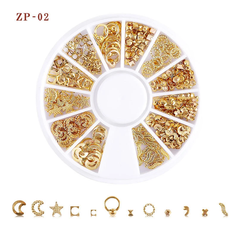 12 стилей ногтей колеса розовое золото/серебро/золото 3D Гвозди заклепки металлические звезды смешанные узоры плоская задняя металлическая отделка ногтей