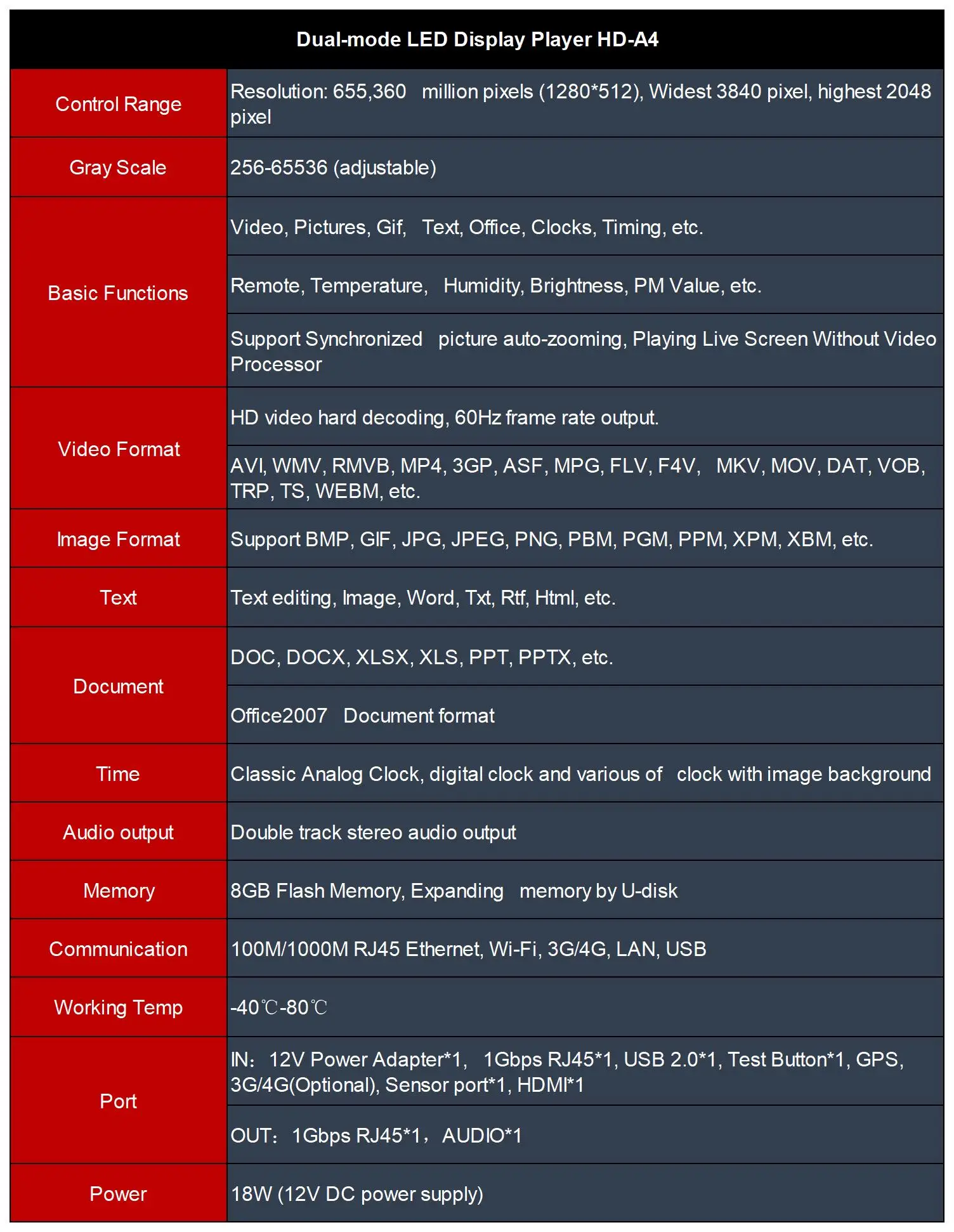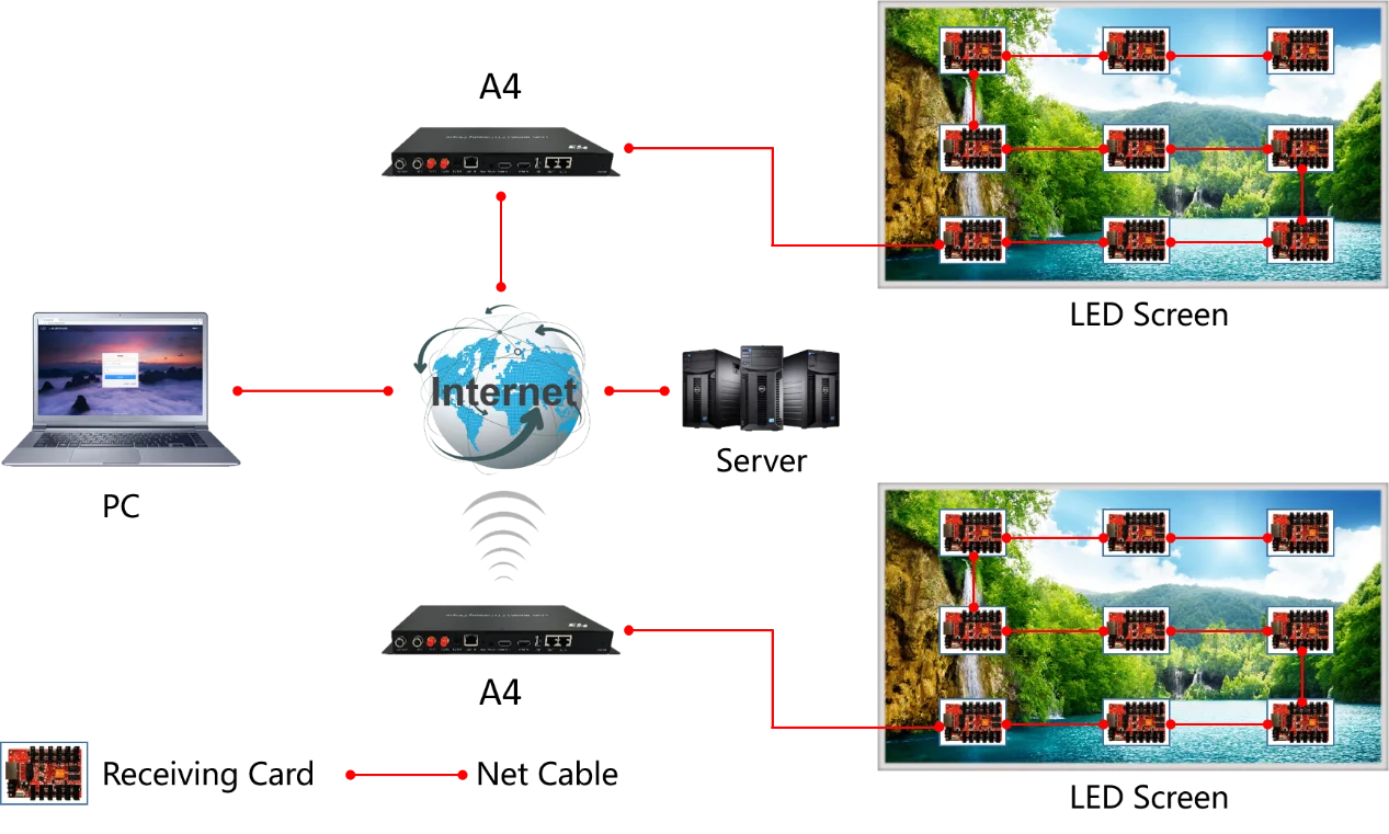 HD-A4-это двухрежимный светодиодный дисплей второго поколения, поддерживает Асинхронное воспроизведение, синхронное воспроизведение, гнездо u-диска и функции автоматического масштабирования видео с максимальной нагрузкой 655360 пикселей. Поставляется с модулем Wi-Fi, поддерживает управление мобильным приложением. Оснащен памятью объемом 8 ГБ, поддерживает использование памяти U-disk. Поддержка дополнительного модуля 4G, пульт дистанционного управления кластером.