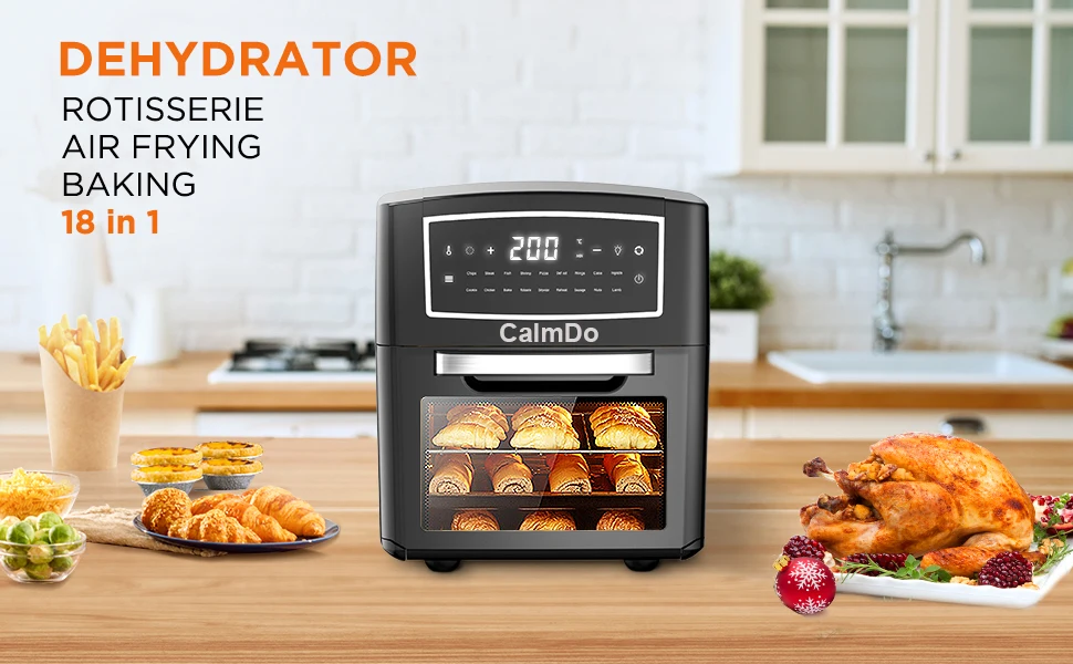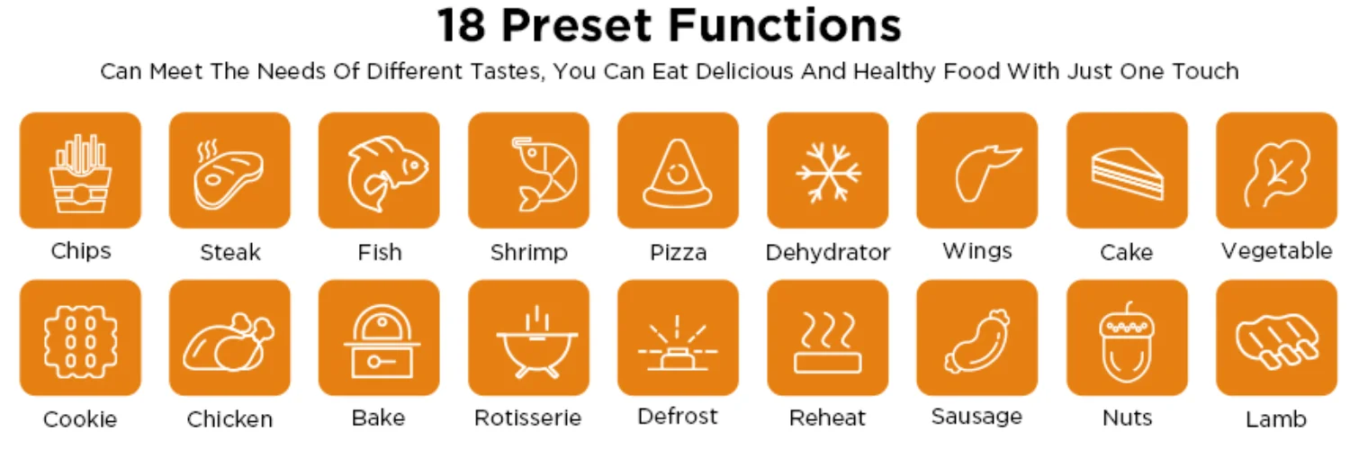 Эта воздушная печь предварительно запрограммирована с 18 режимами приготовления, чтобы быстро подготовить сегодня еду. Согласно предоставленным рецептам, вы можете регулировать температуру от 65 ° до 200 ° и от 1 до 90 минут. В режиме обезвоживания, вы можете выбрать от 1 до 24 часов, в зависимости от типа пищи и количества порций.