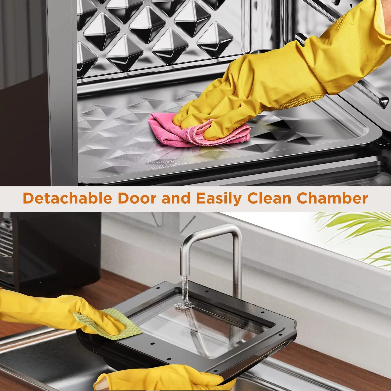 Дверь предназначена для отсоединения для легкой очистки, открывая дверь, останавливает цикл приготовления пищи, закрывая дверь возобновит ранее запрограммированный цикл приготовления пищи. Более того, вы можете включить светильник и следить за приготовлением пищи через прозрачную и термозащитную дверь.