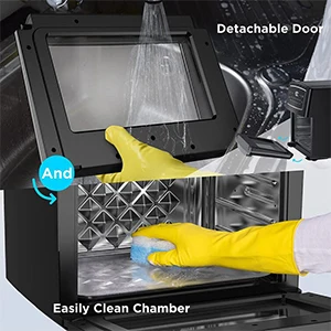 Вы можете легко очистить плоскую поверхность влажной мягкой тканью или губкой. Вместе со съемной дверью все аксессуары легко снимаются для мытья посуды после каждого использования. Полностью открытый интерьер позволяет воздуху быстрее сохнуть, делая очистку крошек и частиц пищи ветерком.