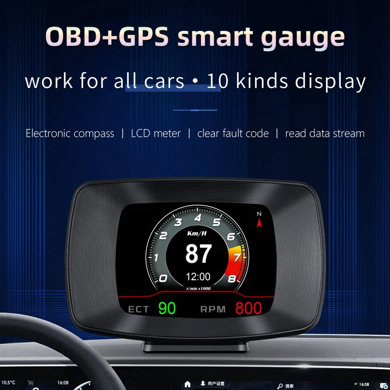 Функция режима OBD: скорость транспортного средства, температура воды, напряжение, расход топлива, скорость, один пробег, общий пробег, совокупное время в пути, направление движения, количество звезд, высота, часы, давление впуска, температура масла, соотношение воздуха и топлива, турбо давление, дроссельная заслонка, температура впуска, нагрузка двигателя, Испытание на ускорение, испытание на тормоз, Определение неисправности, четкий код неисправности