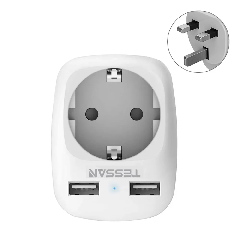 Адаптер для путешествий из 2-контактный Европейская силовой провод Schuko TO 3 pin Великобритании, Гамбия, Hong Kong, Ирландия, Кения, Мальта, Сейшельские Острова, Сингапур, Уганду, долл. США; два USB порта могут заряжать до 2,4 A. Идеально подходит для зарядки электрических продуктов, таких как мобильный телефон, планшет, внешний аккумулятор и т. д., и подходит для некоторых устройств (Фены), не более 3250 Вт