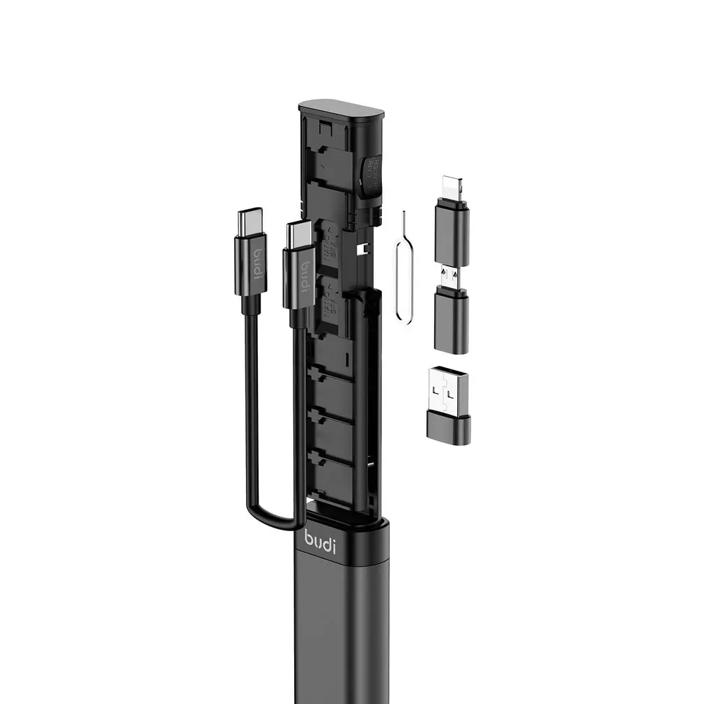 Features: 1. 3 types of adapters: There are USB A to USB C B Adapter, USB C B to Micro USB Adapter, and USB C B to Phone Adapter. 2. TF Card Memory Reader: Cable Stick can read TF memory cards and support both USB or Type C port.and at same time support 7 PCS TF card storage. 3. Phone Cradle: One second to set up budi Cable Stick as a phone cradle. that you can watch movie on your phone hands-free. 4. 6 types cable: There are USB C to USB C cable, which support PD chargeing and fast charge cable. 5. SIM Kit: Multi-functional box can help you and that includes a SIM ejector pin and 2 SIM card storage. It might simple, but is an important assistant to you. Description: Cable Stick is a revolutionary design that integrates all the essential and most frequently used cables connectors; a Type C to Type C cable with 3 types of adapters which makes up to 6 different types of cables. Specifications: Color:Black, red(optional) Size:29*16*132mm Cable length:17cm Interface: 8PIN, Micro USB, TYPE-C Material: aluminum alloy, ABS, PVC Through current: 65W C to C cable Package Included: 1 * Cable Stick