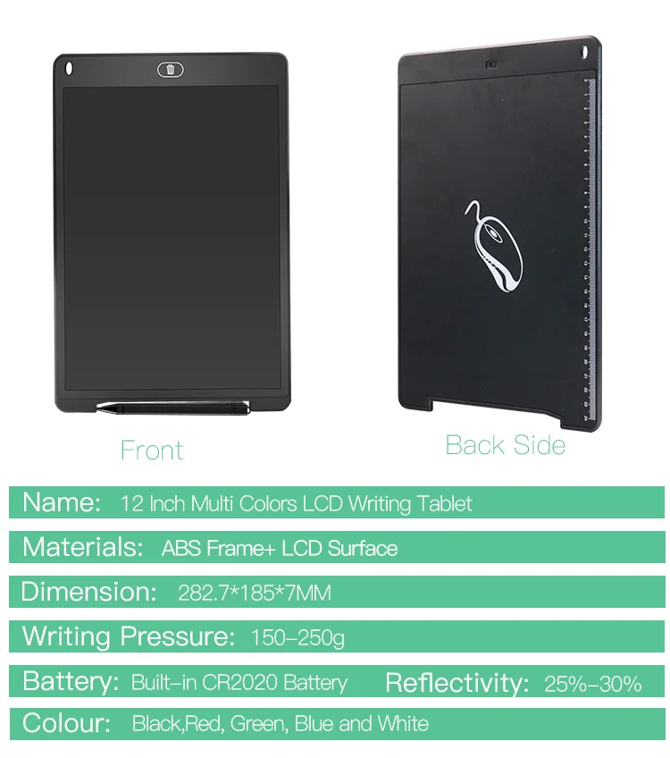 Write at the touch/light and conveninet /pressure-sensitive Button function description①LCD flexible LCD screen②ABS reinforced frame③Smooth Writing④One key delete button⑤One-key lock screen switch⑥Gift 2pcs button battery With just one tap, the traces of thte drawing are instantly cleared,efficient without leaving marks,and you can draw quickly without waitingThere are 2 types of 15inch writing tablet, one is with metal button,another one is with plastic button.