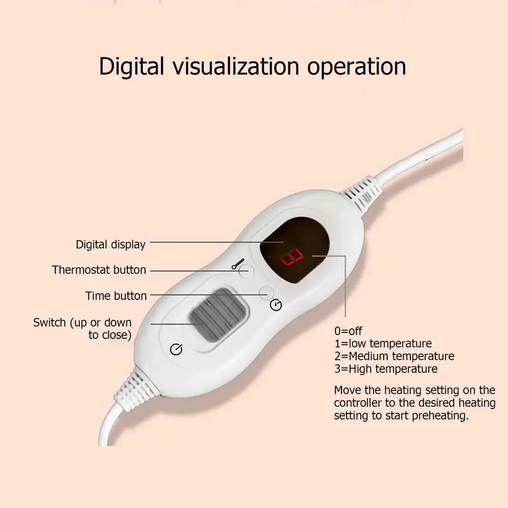 1. 3 уровня свободной регулировки: Выберите температуру, которая подходит коже по желанию, и мощность может быть скорректирована на 2 4 6 8 часов. Температура регулируется в зависимости от нагрева и охлаждения. При достижении температуры постоянная температура устанавливается автоматически. Его можно использовать как тонкое одеяло без подключения. Его можно использовать во все сезоны, чтобы удовлетворить вас. Потребность в тепле в течение всего года.