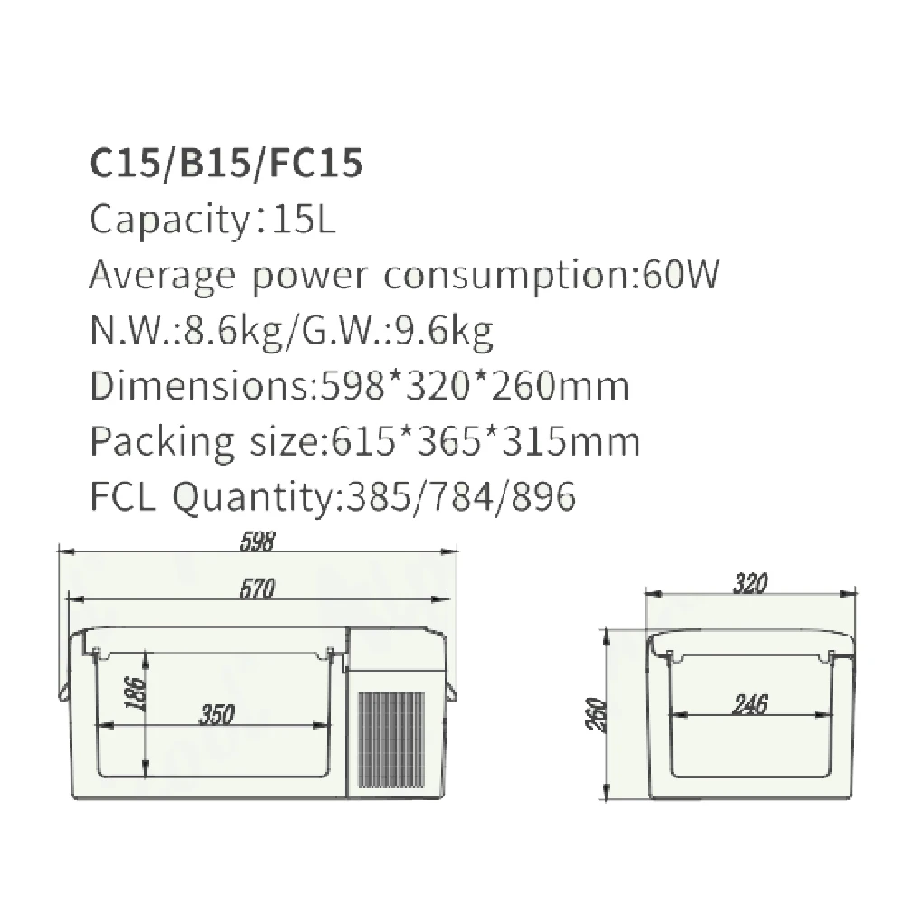 15L: 598*320*260 мм/23,54*12,6 * 10.2in