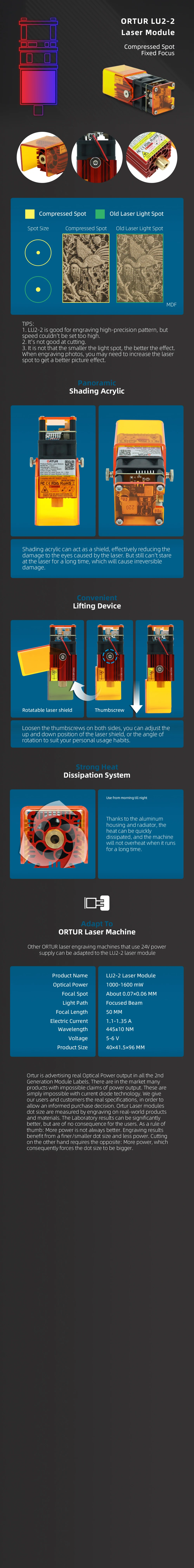【Ortur LU2-4LF Laser Module】: 2022 новый усовершенствованный LU2-4 лазерный модуль, это высокая мощность и имеет более высокую глубину поля. Обратите внимание: лазерный модуль 24 В подходит только для гравировальных машин 24 В.