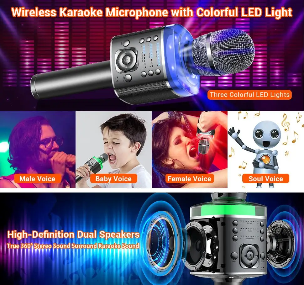 Новейший Bluetooth 5,0-этот микрофон использует технологию Bluetooth 5,0, совместимую с поверхностью iPad и всеми смартфонами. И вы можете использовать караоке микрофон для записи вашего четко аудио и ярко звуковой эффект в вашем телефоне через 3,5 мм аудио кабель; Поддержка TF карты памяти до 32 Гб.