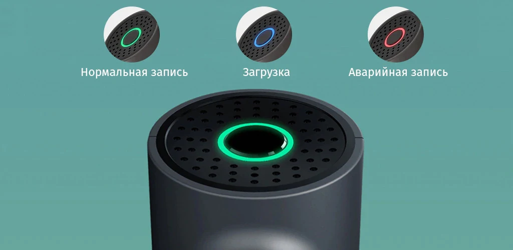 На лицевой стороне устройства находится светодиодный индикатор работы видеорегистратора, который сигнализирует о включении и выключении записи видео, а также о переходе в режим фото.