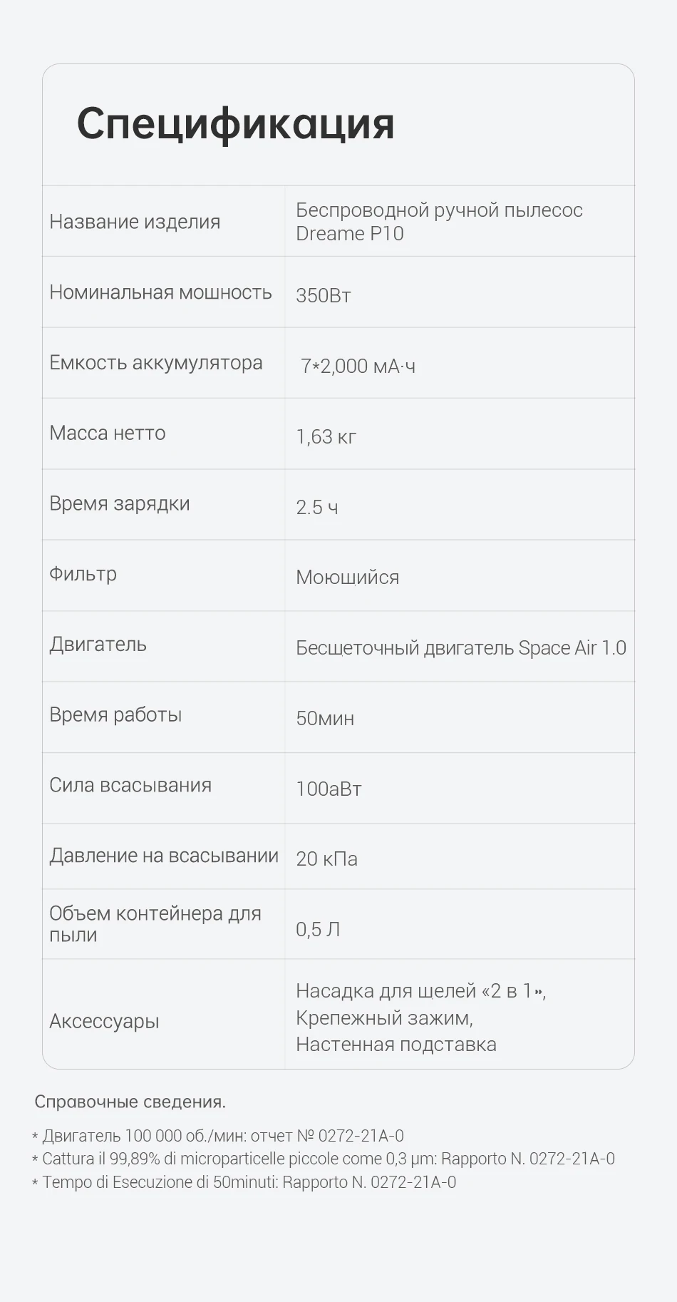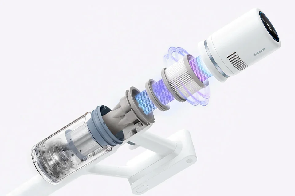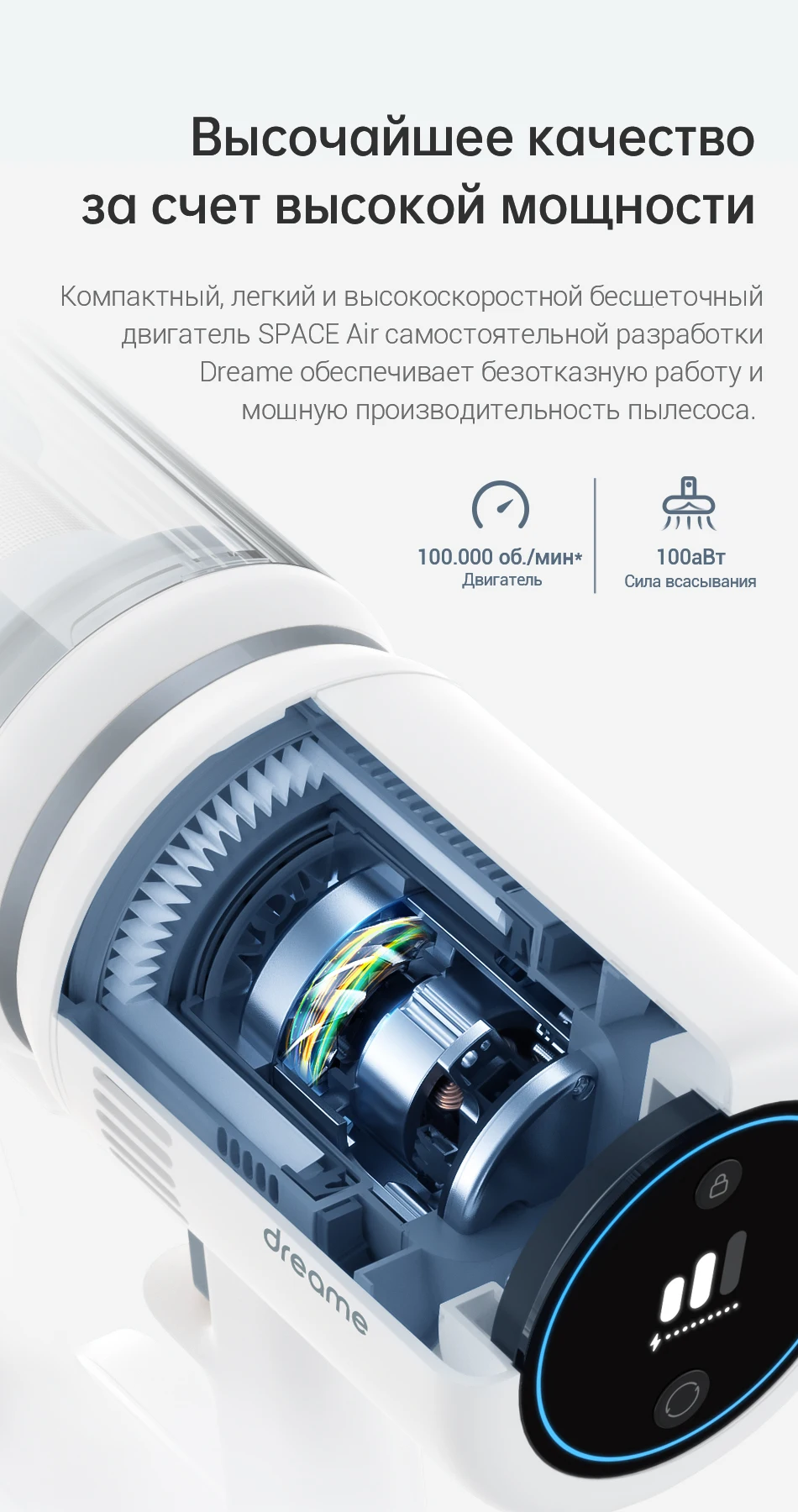 Space Air 1.0 – бесщёточный мотора с частотой вращения до 100.000 об/мин, собственная запатентованная разработка компании Dreame. Благодаря инновационным разработкам он легче и компактнее своих предшественников. Обеспечивает высокую энергоэффективность, мощность всасывания до 100 аВт и силу вакуума до 20.000 Па!