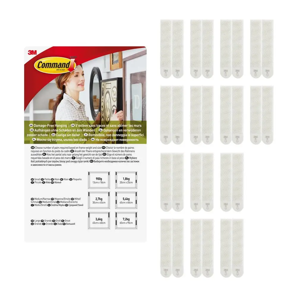 С помощью застежек Command можно быстро и легко украсить интерьер. А когда вы снова будете готовы к переменам, их можно легко снять, не повреждая поверхности. Никаких отверстий, повреждений краски или следов клея. Возможности декорирования безграничны! Идеально подходят для съемного жилья, если вы не хотели бы повреждать стены. Большие полоски подойдут для большинства рамок размером до 60см х 90см.