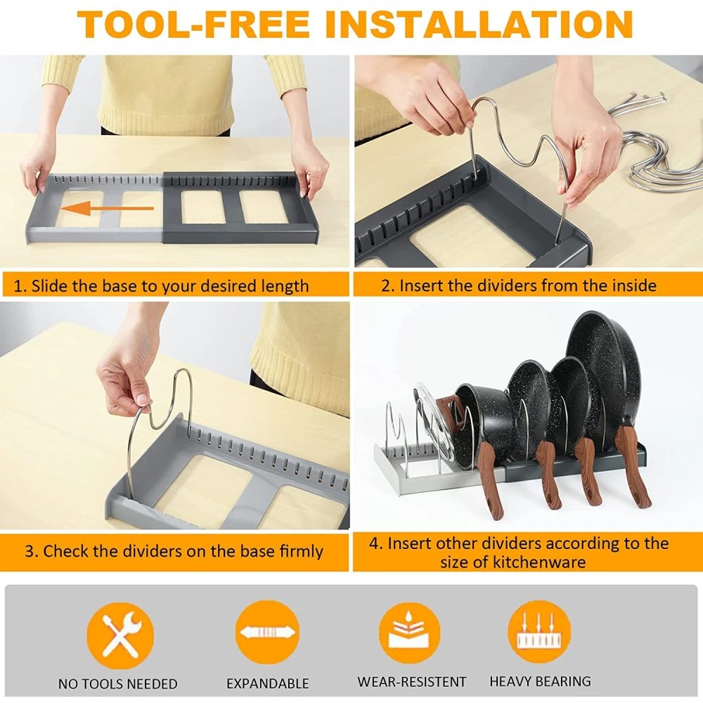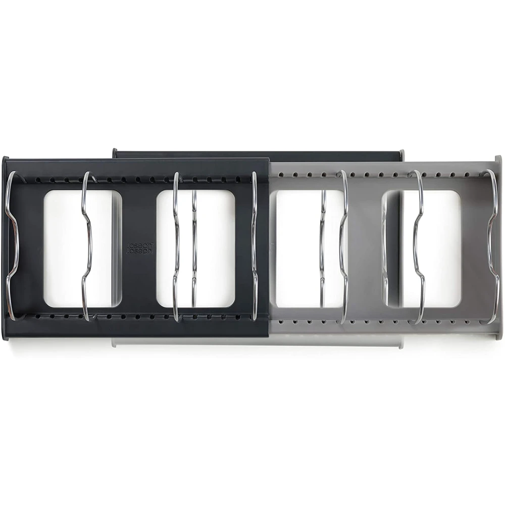 Уход и использование: протрите влажной тканью. Не используйте абразивные салфетки или сильные химические чистящие средства. Инструкции по сборке: 1. Вытяните основание до желаемой ширины. 2. Нажмите один конец провода делителя в слот. 3. Сжимайте провод до тех пор, пока другой конец не поместится в слот, противоположный. 4. Регулировка положения проводных разделителей по мере необходимости