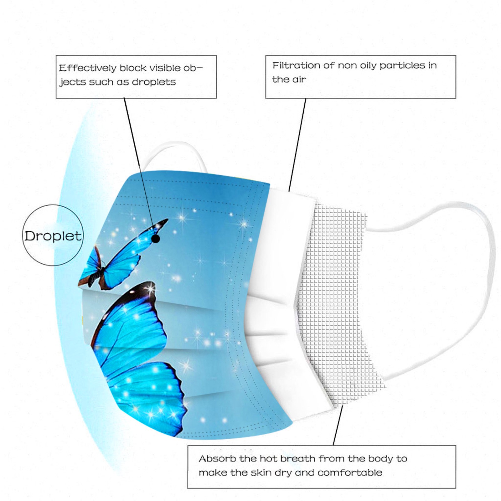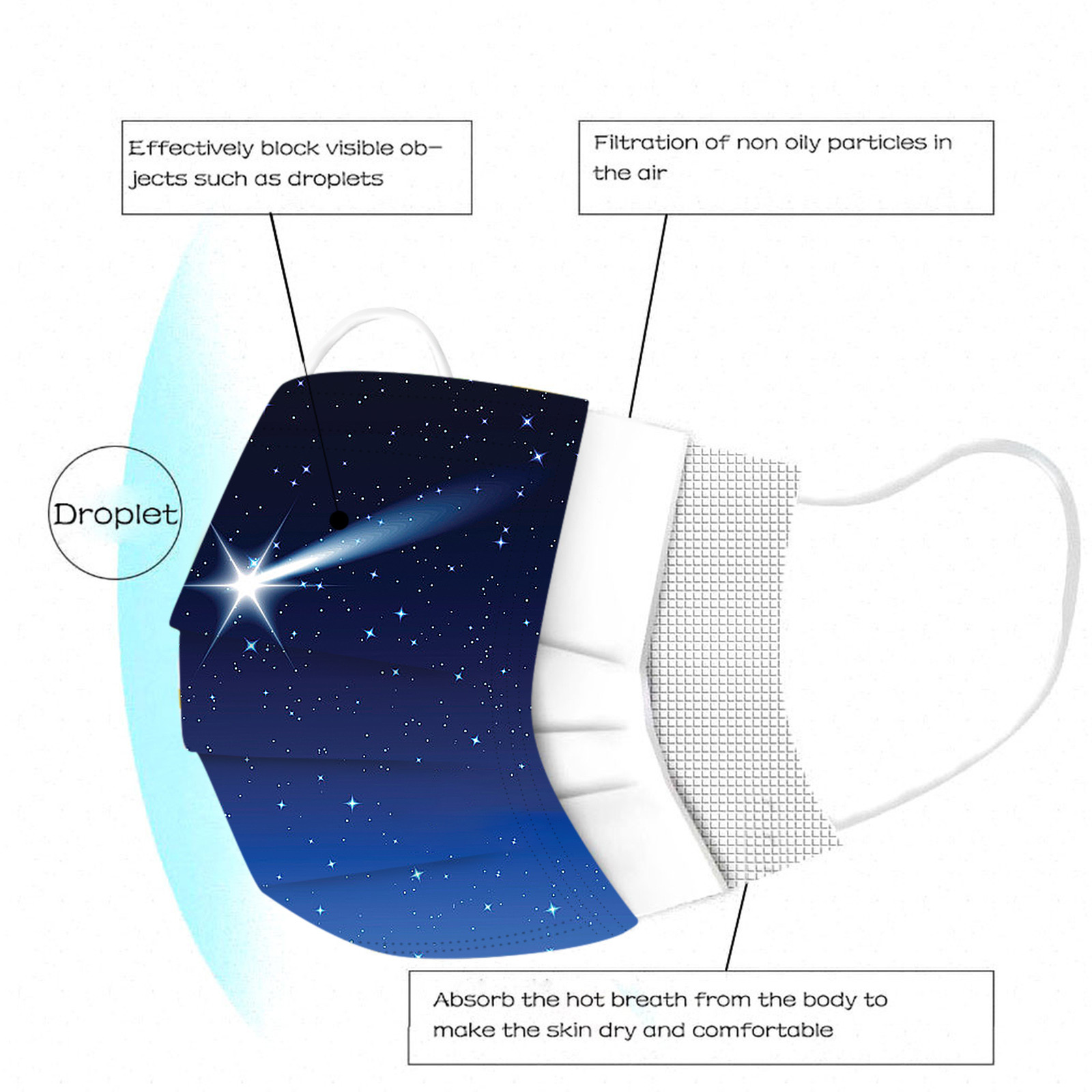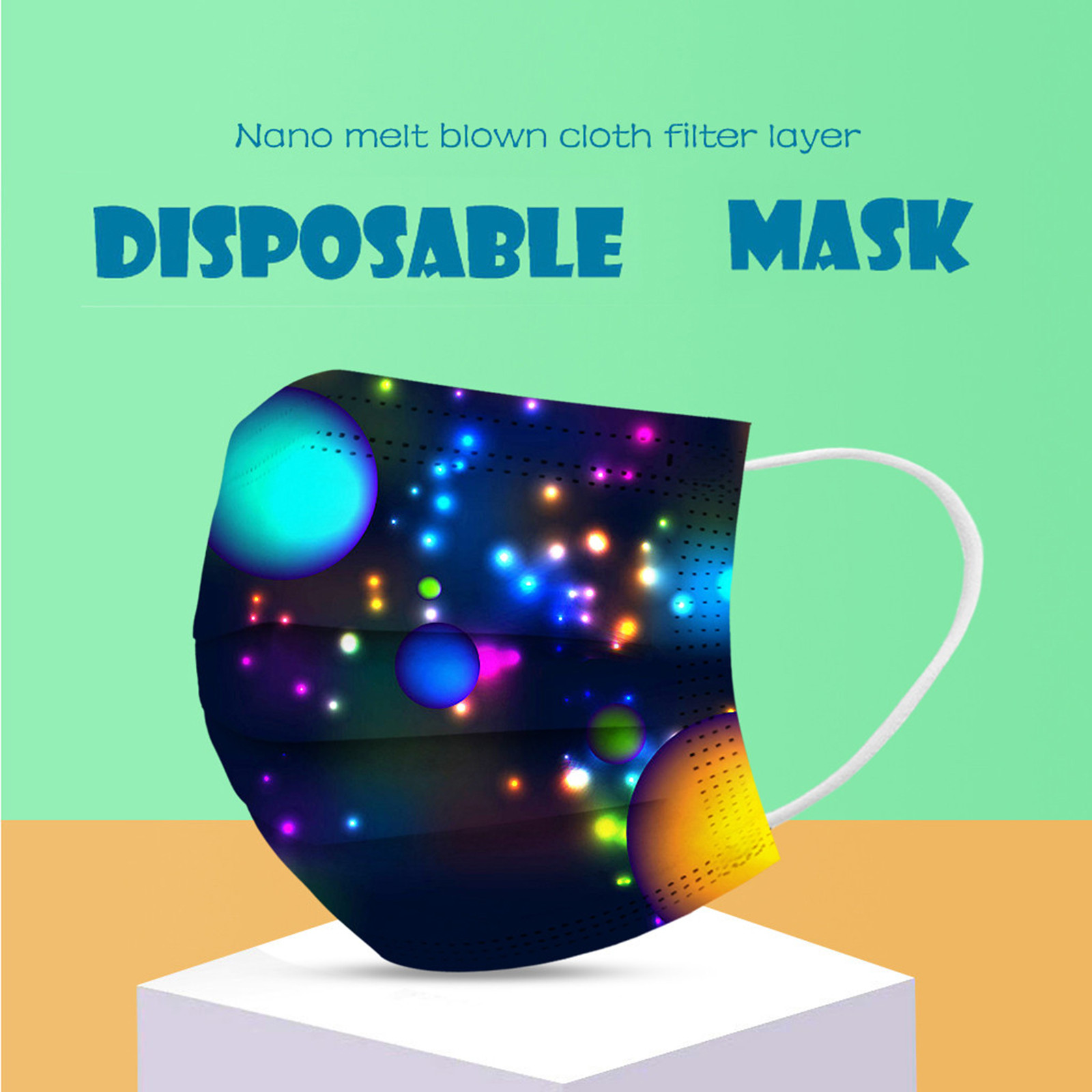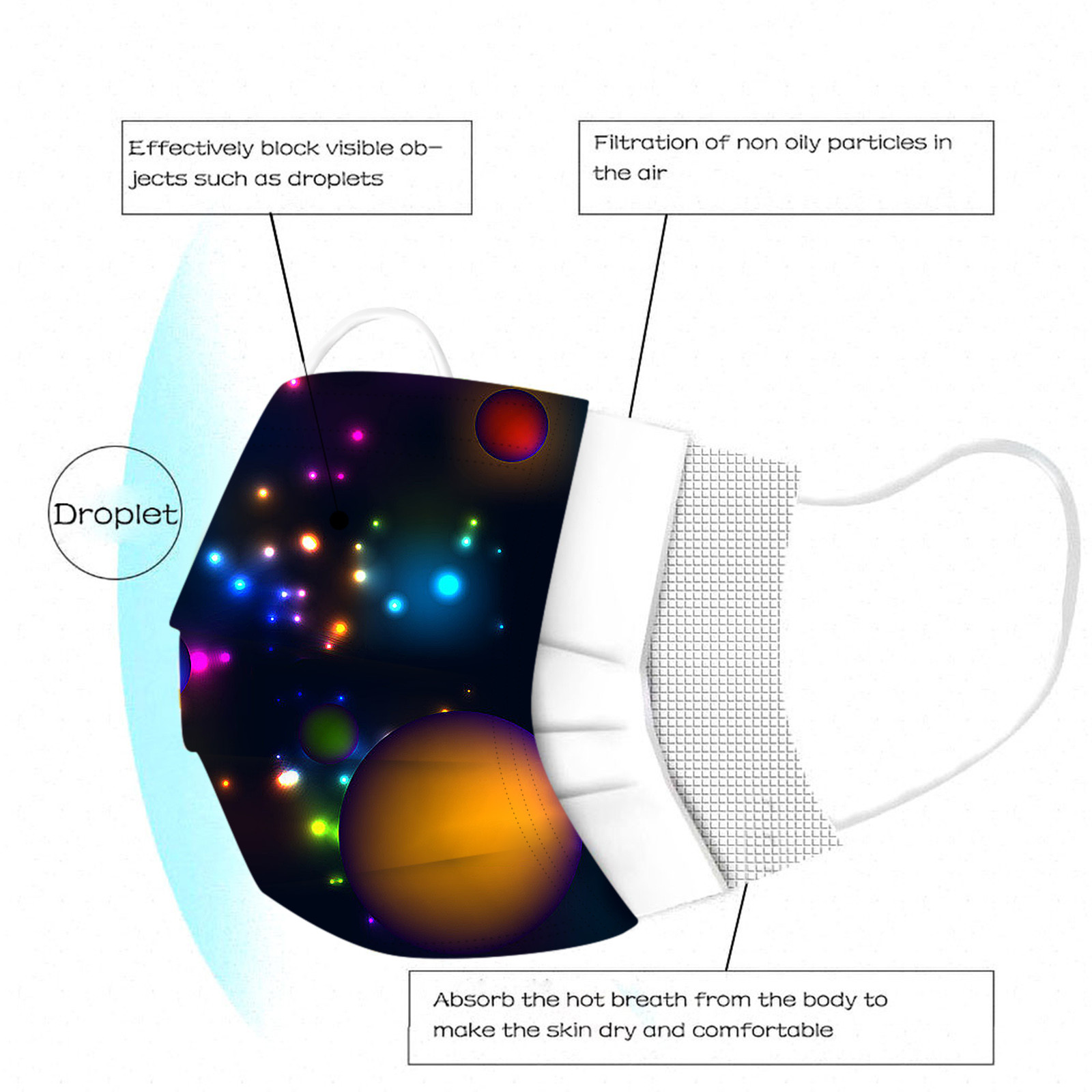 В 3 слоя Нетканая одноразовая маска изготовлена из 3 слоев нетканого материала, Безопасен и безопасен для использования. Дышащий материал и милый Узоры, которые делают его полезным и модным. Специальный 3 слоя из нетканого материала Дизайн, обеспечивает некоторую защиту от пыли, автомобильных выхлопных газов, Пыльца и т. д. эластичная Ушная петля, легко носить и не давит на уши. Маникюрный салон или любые другие области, где может потребоваться защита