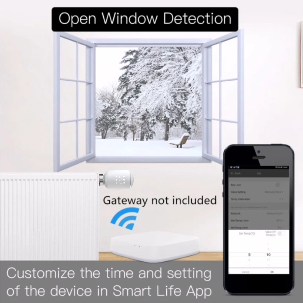 5. Обнаружение открытого окна: когда температура в помещении неожиданно падает в темп. Порог, клапан закроется в течение 15 минут. После этого, если температура в помещении. Все еще ниже, чем температура. Порог, он сохранит этот режим. Кроме того, его легко читать цифровой дисплей с температурой Цельсия.