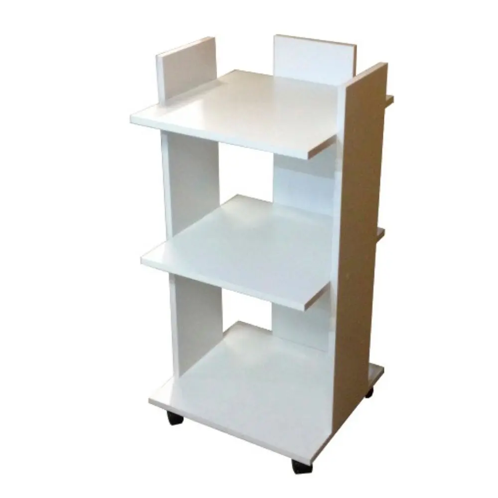 Конструктив косметологической тележки очень удобен. По бокам и сзади две вертикальные стенки, их пересекают горизонтальные полки. При этом стенки не примыкают друг к другу. Это сделано для удобства подключения Ваших электроприборов. Материал стенок и полок ламинированная ДСП.