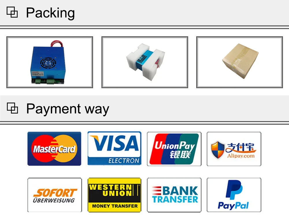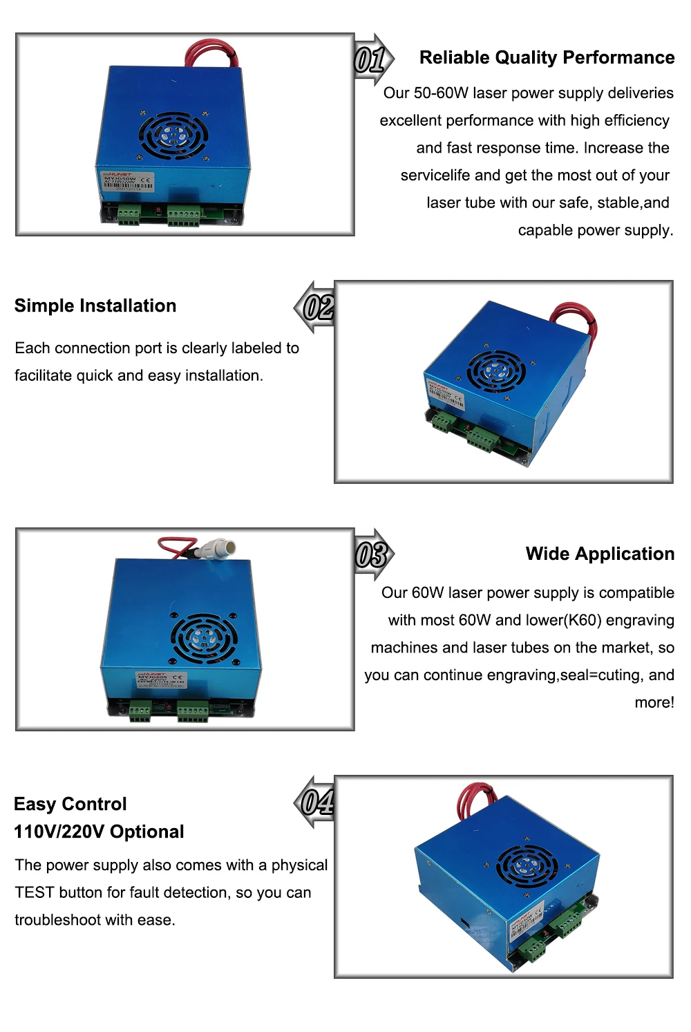 1.Надежное качество: наши лазерные источники питания 50 Вт и 60 Вт обеспечивают превосходную производительность, высокую эффективность и быстрое время отклика. Увеличьте срок службы и получите максимум от вашей лазерной трубки с нашим безопасным, стабильным и мощным источником питания.