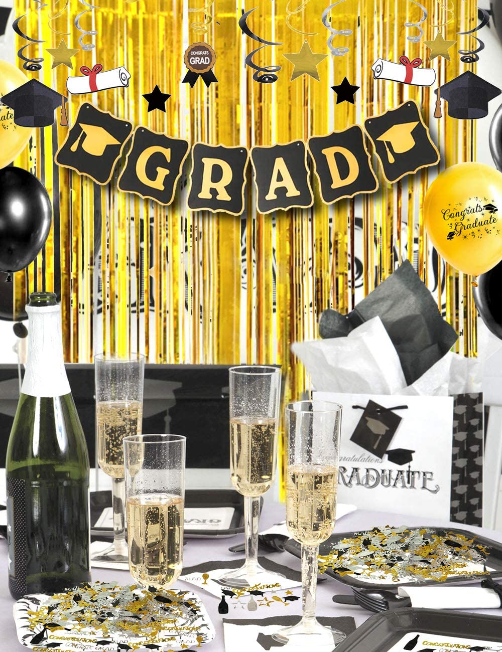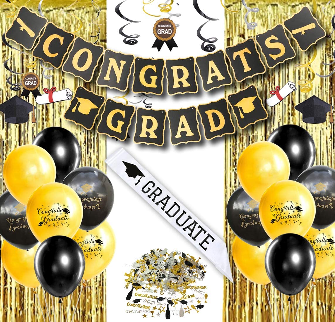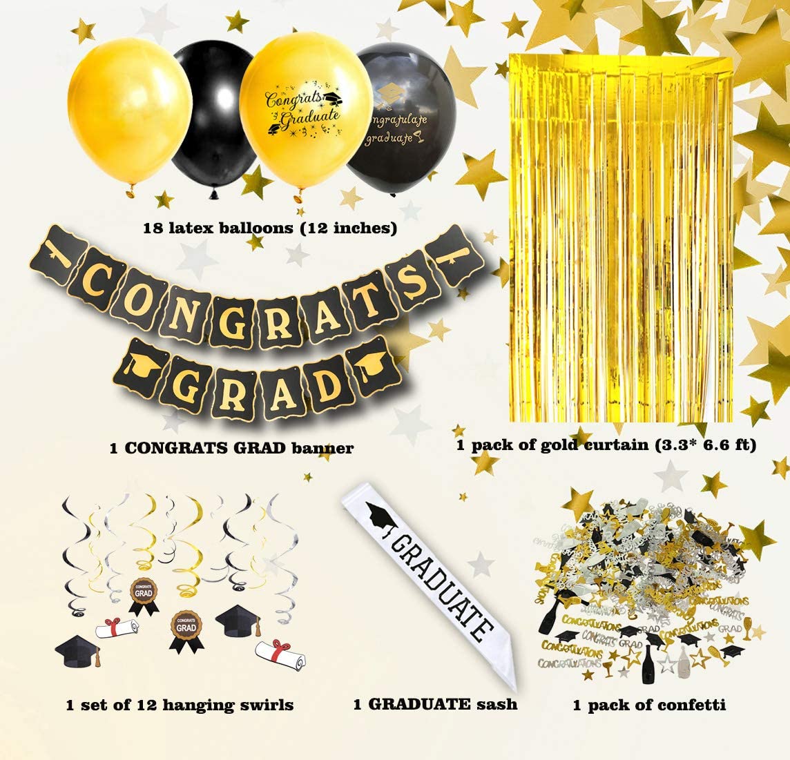 1 знамя града congrats 1 Набор подвесных завитков (12 подвесных завитков, 6 выпускных карточек) 1 упаковка конфетти 1 выпускная створка 18 латексных шаров (9 черных, 9 золотых) 1 золотой с бахромой занавеска