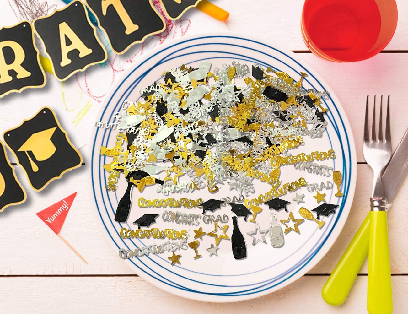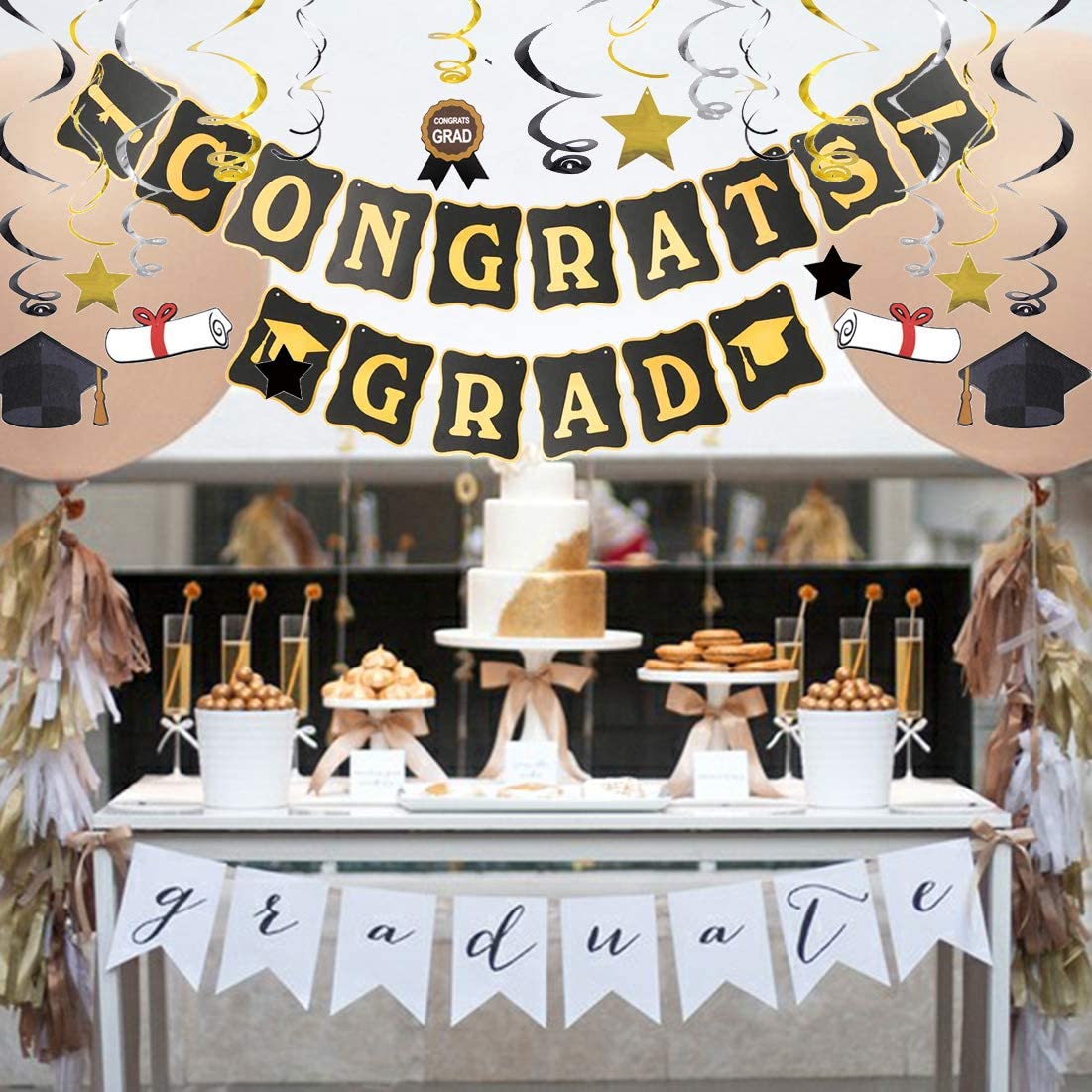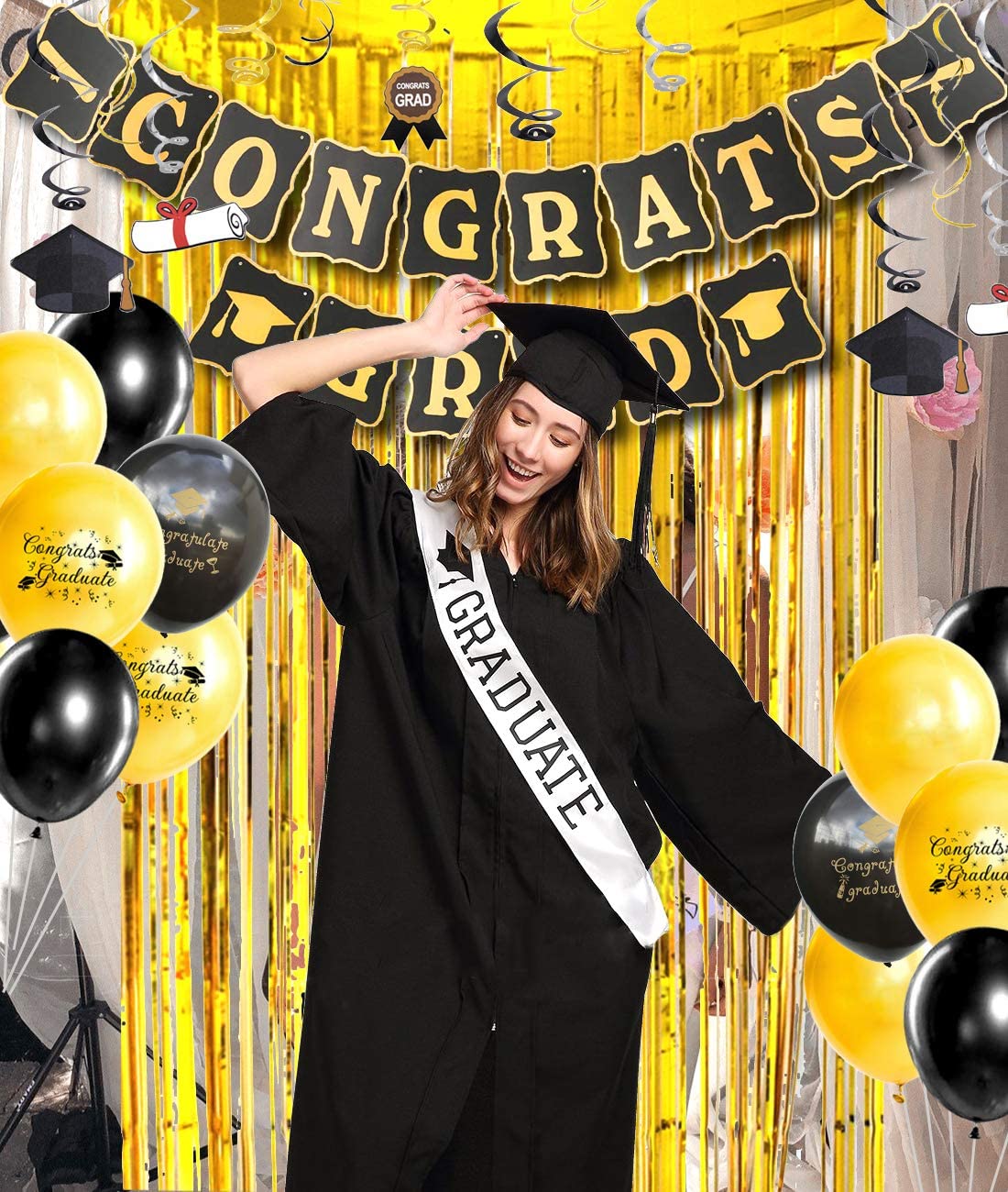 1 знамя града congrats 1 Набор подвесных завитков (12 подвесных завитков, 6 выпускных карточек) 1 упаковка конфетти 1 выпускная створка 18 латексных шаров (9 черных, 9 золотых) 1 золотой с бахромой занавеска