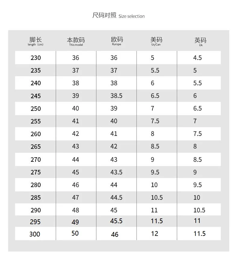 1. Пожалуйста, выберите размер в соответствии с вашей реальной длиной стопы из приведенной ниже таблицы, а не привычки.