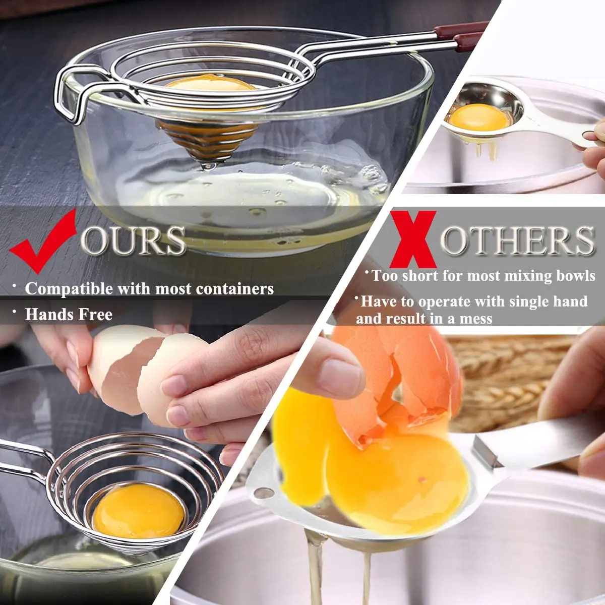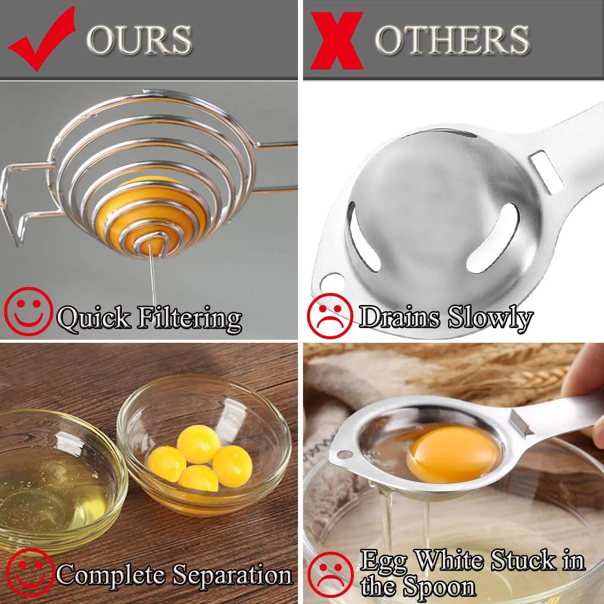Мгновенное и полное разделение: расширяемая спиральная структура позволяет фильтру яичного белка пройти через несколько секунд. Большая емкость может быть использована с полноразмерными или гигантскими яйцами, что делает выпечку легкой.