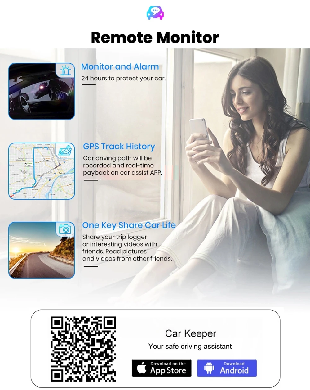 Отслеживайте местоположение вашего автомобиля, удаленно фиксируйте, что происходит с вашим автомобилем из любой точки мира. Просматривайте изображения и смотрите видеоклипы вашего автомобиля с помощью приложения на вашем смартфоне, как только вы Подключитесь к Интернету.