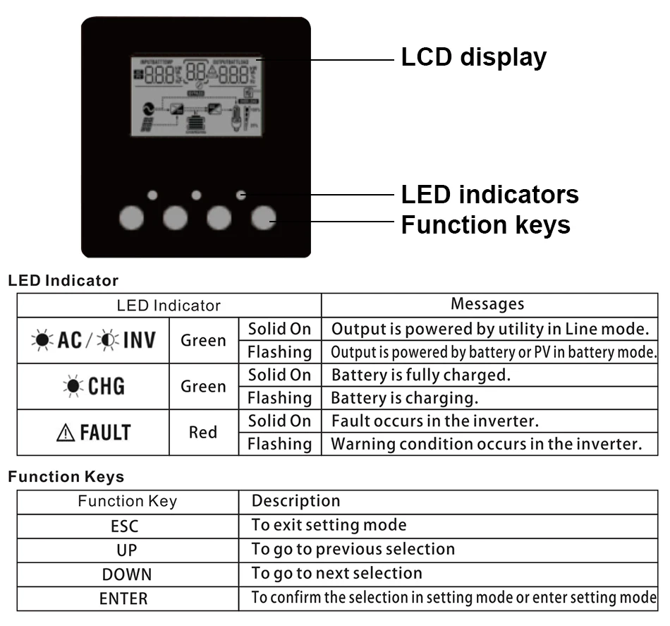 Это многофункциональный инвертор/зарядное устройство, сочетающее функции инвертора, солнечного зарядного устройства и зарядного устройства для обеспечения бесперебойного питания с портативным размером. Его Полный ЖК-дисплей предлагает настраиваемое и легкое управление кнопками, такими как ток зарядки аккумулятора, приоритет переменного/солнечного зарядного устройства и приемлемое входное напряжение на основе различных приложений.