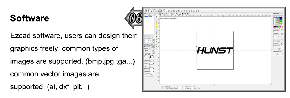 6. Программное обеспечение:Пользователи программного обеспечения Ezcad могут свободно создавать свою графику, поддерживаются общие типы изображений. (bmp,jpg,tga...) поддерживаются общие векторные изображения. (ai, dxf, plt...)