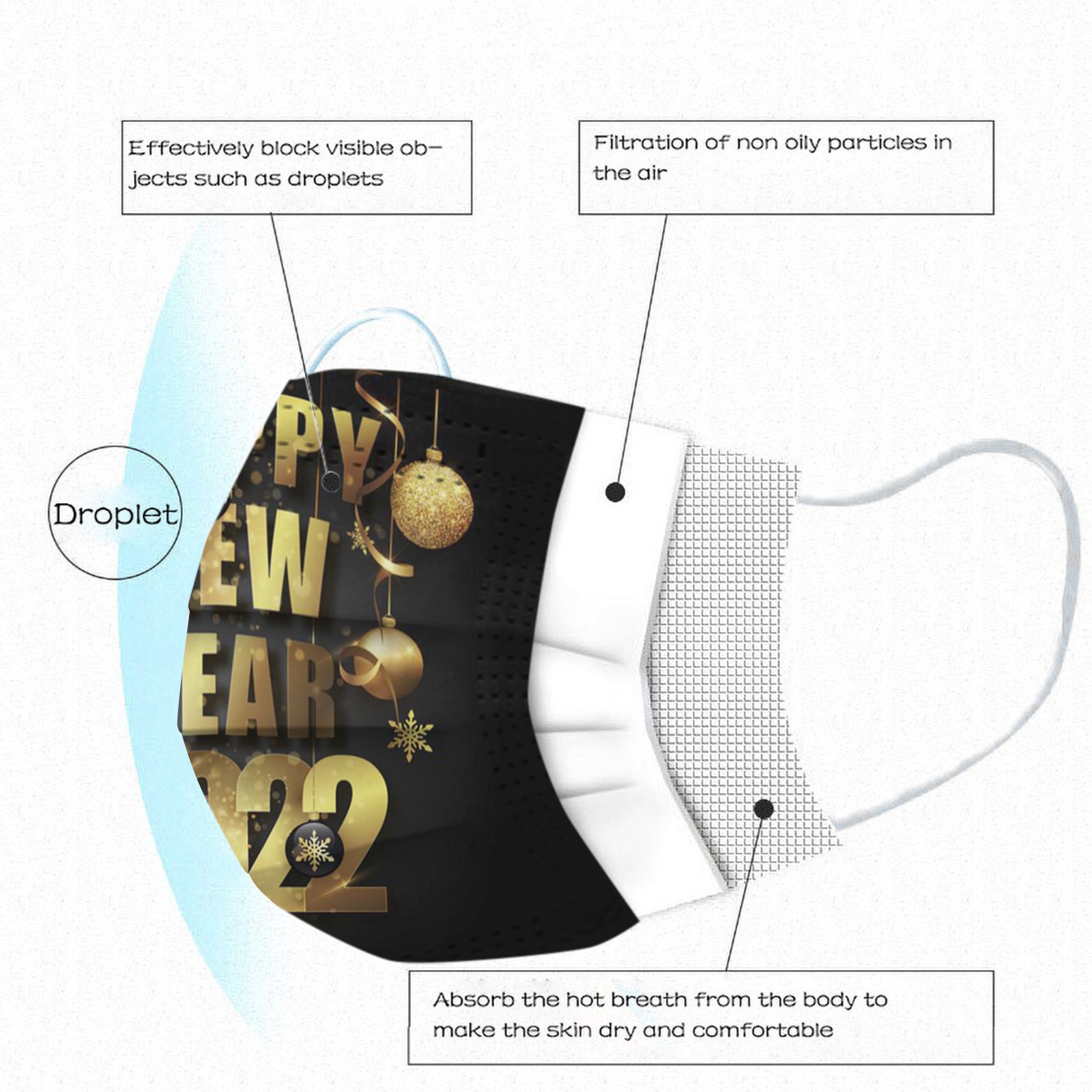 Маска для лица, три слоя защиты, изготовлен из фильтрующего слоя расплава и нетканого полотна. Рождественская одноразовая маска для лица, поверхность равномерно покрыта воздушными порами, хорошая воздухопроницаемость. Рождественская маска, Регулируемый мягкий зажим для носа лучше подходит для лица. Предоставляя вам удобство при ношении. Одноразовые маски для лица, дышащее пространство, которое отвечает потребностям различных контуров лица и может использоваться детьми. Рождественская маска для лица, подходит для большинства общественных мест и обеспечивает защиту вашего путешествия.Товары включают:
