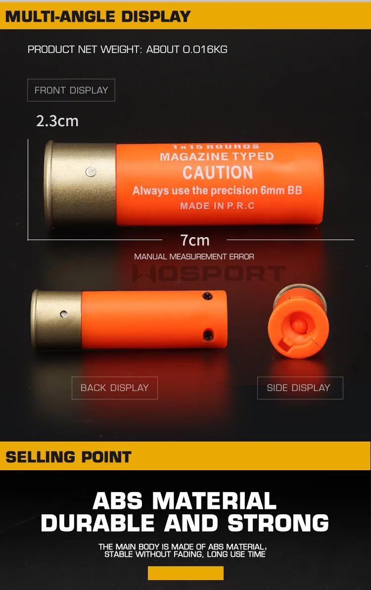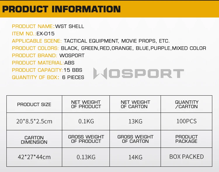 -- Название продукта: корпус дробовика (15 BBs) 6 шт. -- Бренд продукта: ,Wosport -- Номер товара: EX-015 -- Упаковка продукта: упакованная коробка -- Размер продукта: 20*8,5*2,5 см -Вес нетто: 0,1 кг -- Вес брутто продукта: 0,13 кг -- Использование продукта: тактическое оборудование, реквизит для фильмов и т. Д. -Размеры коробки: 42*27*44 см -- Основной Материал: АБС-пластик
