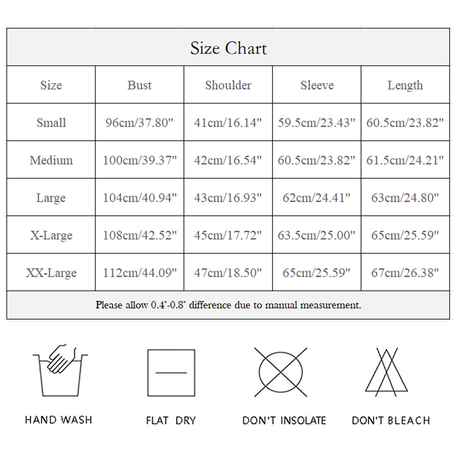 Размеры Бюст Плечо Рукав Длина S 96 см/37,80'' 41 см/16,14'' 59,5 см/23,43'' 60,5 см/23,82'' М 100 см/39,37'' 42 см/16,54'' 60,5 см/23,82'' 61,5 см/24,21'' L 104 см/40,94'' 43 см/16,93'' 62 см/24,41'' 63 см/24,80'' XL 108 см/42,52'' 45 см/17,72'' 63,5 см/25,00'' 65 см/25,59'' XXL 112 см/44,09'' 47 см/18,50'' 65 см/25,59'' 67 см/26,38''
