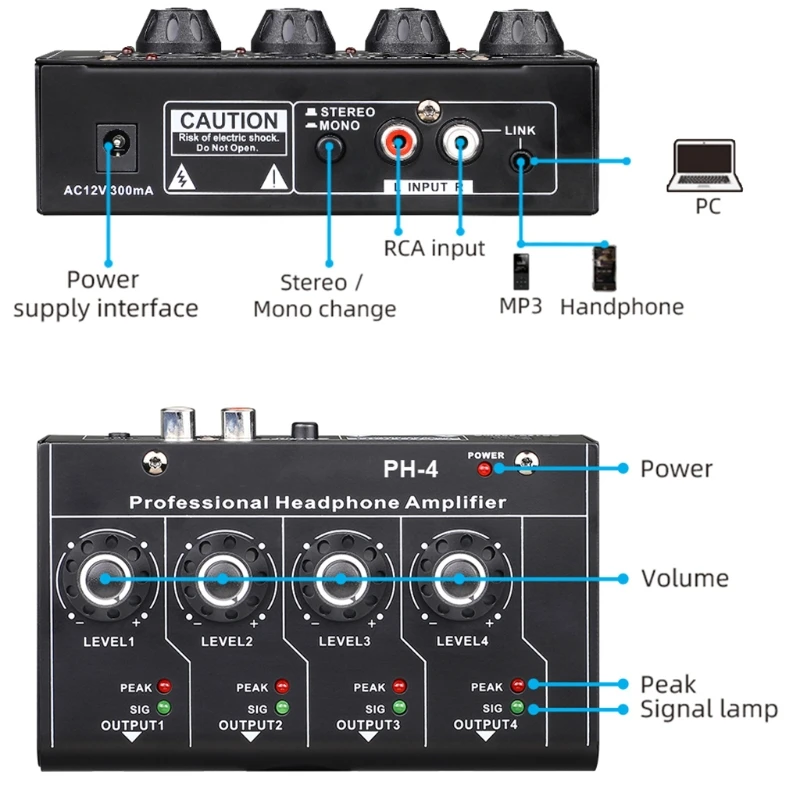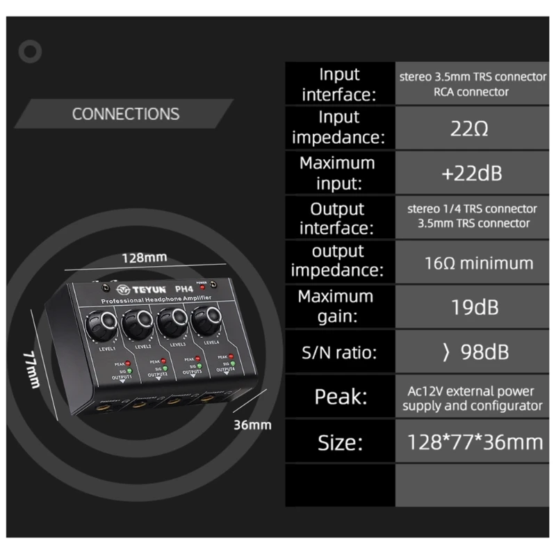 6,35 мм/3,5 мм стерео выход ультра-компактный 4 канала мини усилитель для наушников <;br/>OOTDTY <;br/> Особенности: 100% новый бренд и высокое качество <;br/> четырехканальный стерео усилитель для наушников.<;br/> PH-4-это мини четырехканальный стереозвук, предназначенный для аудио и видео приложений с независимым регулятором громкости и выходом наушников/линии. <; Br/>DC PWR: используется для подключения питания DC12V 300 мАч.<;br/>: четыре 6,35 мм стерео выходными портами, четыре 3,5 мм стерео выходными портами.<;br/>4 канала Независимый регулятор громкости, стерео и моно можно переключать.<;br/> Спецификация: спецификация s:<;br/> Тип изделия: усилитель для наушников <;br/> Модель: PH-4<;br/> Материал: ABS + металл <;br/> Источник питания: 12 В адаптер постоянного тока <;br/> Размер: 128x77x36 мм <;br/> Цвет: черный <;br/> Количество: 1 шт. <;br/> комплектация: 1 усилитель для наушников <;br/> Примечание:<;br/> Переход: 1 см = 10 мм = 0,39 дюймов <;br/> замеры сделаны вручную, поэтому возможны 0-1 см из-за проведения замеров вручную. Спасибо! Пожалуйста, убедитесь, что вы не возражаете перед покупкой.<;br/> Из-за разницы между различными мониторами изображение может не отражать фактический цвет изделия. Спасибо!