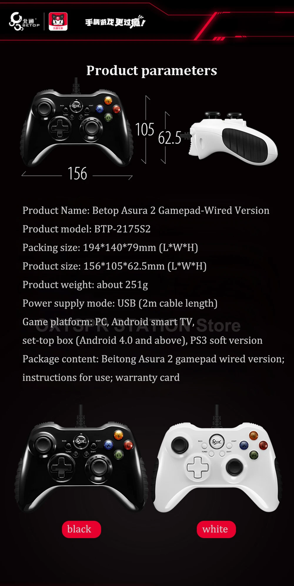 Параметры продуктаНазвание продукта: Betop Asura 2 геймпад-проводная версияМодель изделия: BTP-2175S2Размер упаковки: 194*140*79 мм (Д * Ш * В)Размер изделия: 156*105*62,5 мм (Д * Ш * В)Вес изделия: около 251 гРежим питания: USB (длина кабеля 2 м)Игровая платформа: ПК, Android smart TV, телеприставка (Android 4,0 и выше), мягкая сломанная версия PS3Посылка: Проводная версия Betop Asura 2 геймпада; Инструкции; Гарантийный талон Основные характеристики:Поддержка Tesla in-car game.ТВ/компьютер/пар: 2 метра длинный USB кабель, без задержки. Драйвер не требуется для систем Win7 и выше.Архитектура XBOX, многоплатформенная ручка. Компьютер/телевизор/пар/эмулятор/коробка/ps3 (мягкая сломанная версия)Сильная вибрация, без задержек, адаптируется к нескольким платформамОснащен японскими оригинальными Альпами™Игровой джойстикМногоступенчатый благородный™Линейный триггер: LT/RT принимает японский БЛАГОРОДНЫЙ™Линейный потенциометрАльпы™Сенсорная микро-кнопка плеча: LB/RB Кнопка принимает Японские Альпы™Механический сенсорный Микро-переключатель.Одна клавиша TURBO burst: Нажмите кнопку TURBO + для настройки функции one-key burst.