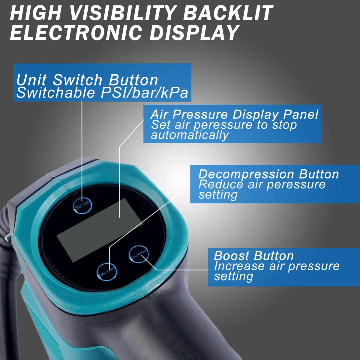 18 в воздушный надувной портативный автомобильный воздушный компрессор насос обрабатывается цифровой перезаряжаемый воздушный компрессор Голый Инструмент для батареи Makita 18 в Особенности: Цифровой манометр Высокая стабильность на земле Функция автоматической остановки при предварительно установленном целевом давлении Светодиодный светильник для работы Легкий и компактный дизайн Эргономичная мягкая ручка Встроенное хранилище для различных адаптеры для клапана Главный выключатель оснащен функцией автоматического отключения Встроенный термостат для защиты от перегрева Подходит для надувания велосипедных и автомобильных шин, спортивных мячей и надувного оборудования для отдыха Технические характеристики Спецификация: Объем воздушного разряда: 12 литров/мин Максимальное давление воздуха: 995 кПа (150 PSI) Тип батареи: литий-ионный Напряжение: 18 в Вес нетто: 1,1 кг Посылка включает в себя: (только корпус) 1 x адаптер клапана Presta 1 x игла для спортивного мяча 1 x конический адаптер