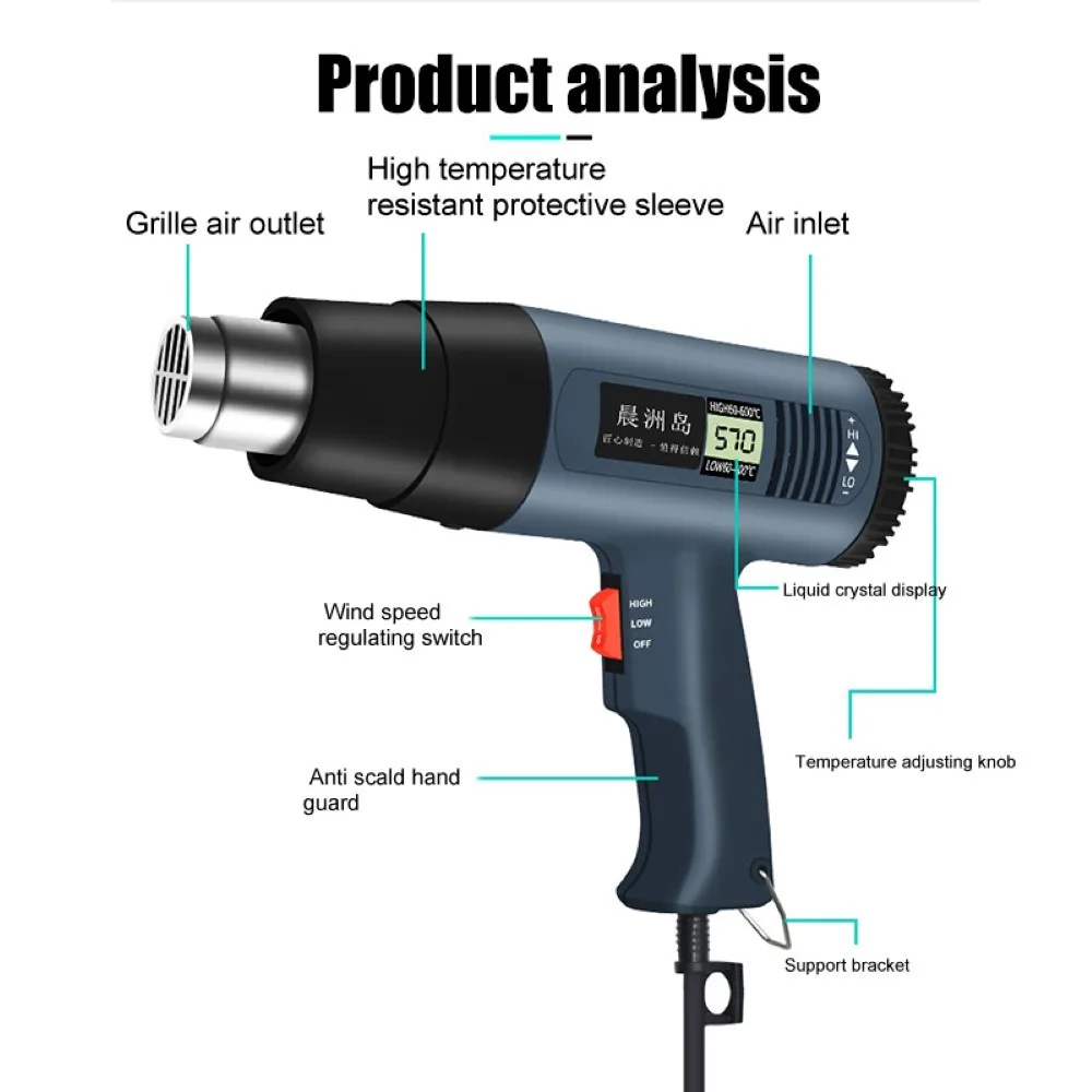 2000 Вт тепловой инструмент: машина горячего воздуха может быстро нагреваться до максимальной температуры, которая показывает ЖК-цифровой дисплей в считанные секунды с мощной системой отопления.