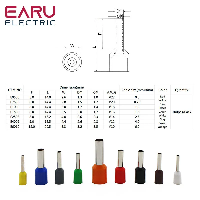 100 шт./упак. E0508 E7508 E1008 E1508 E2508 изолированных кабельных наконечников клеммной колодки конец шнура Разъем провода электрические обжимной Терминатор
