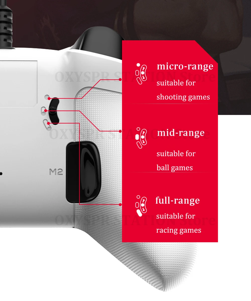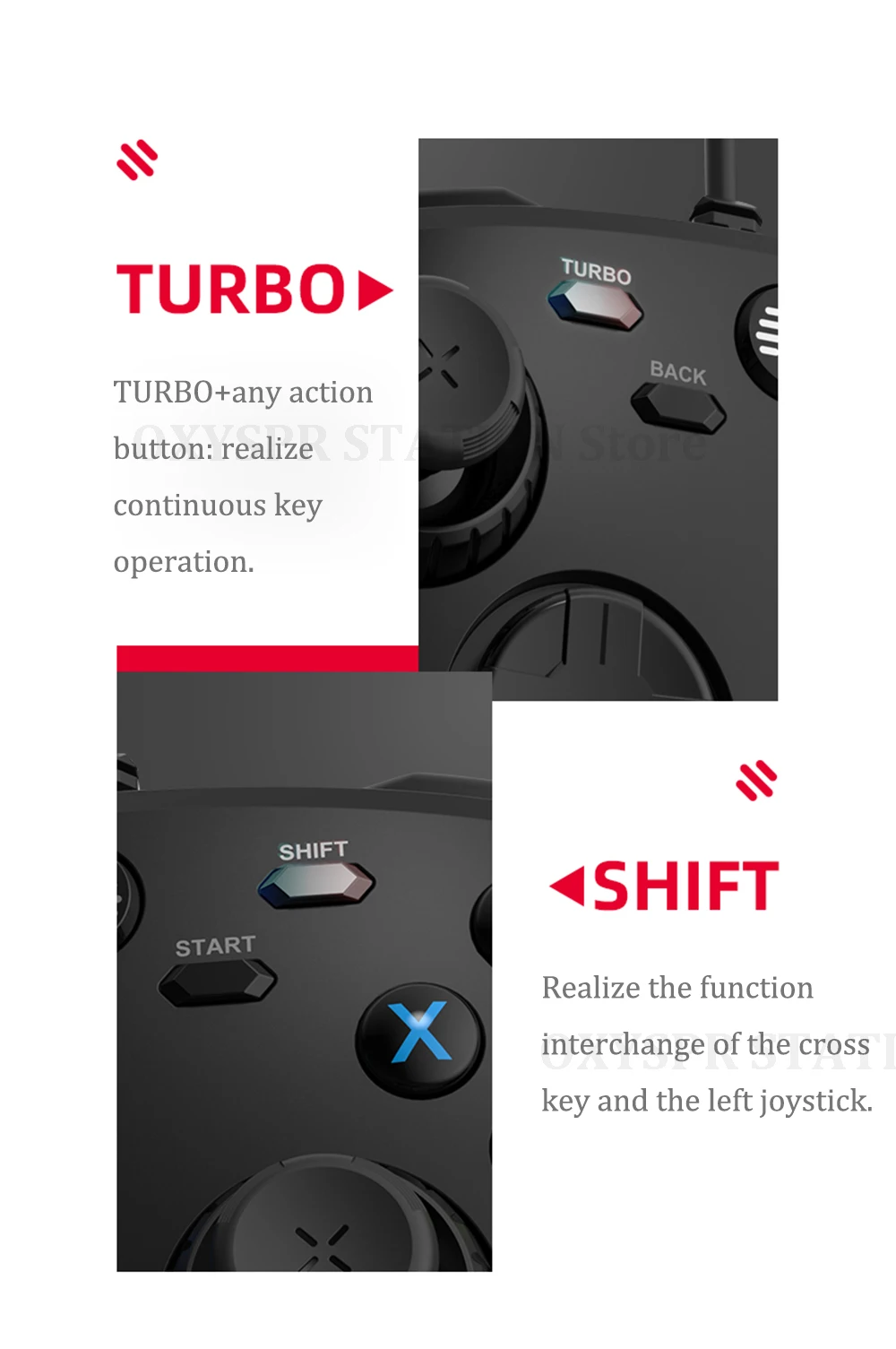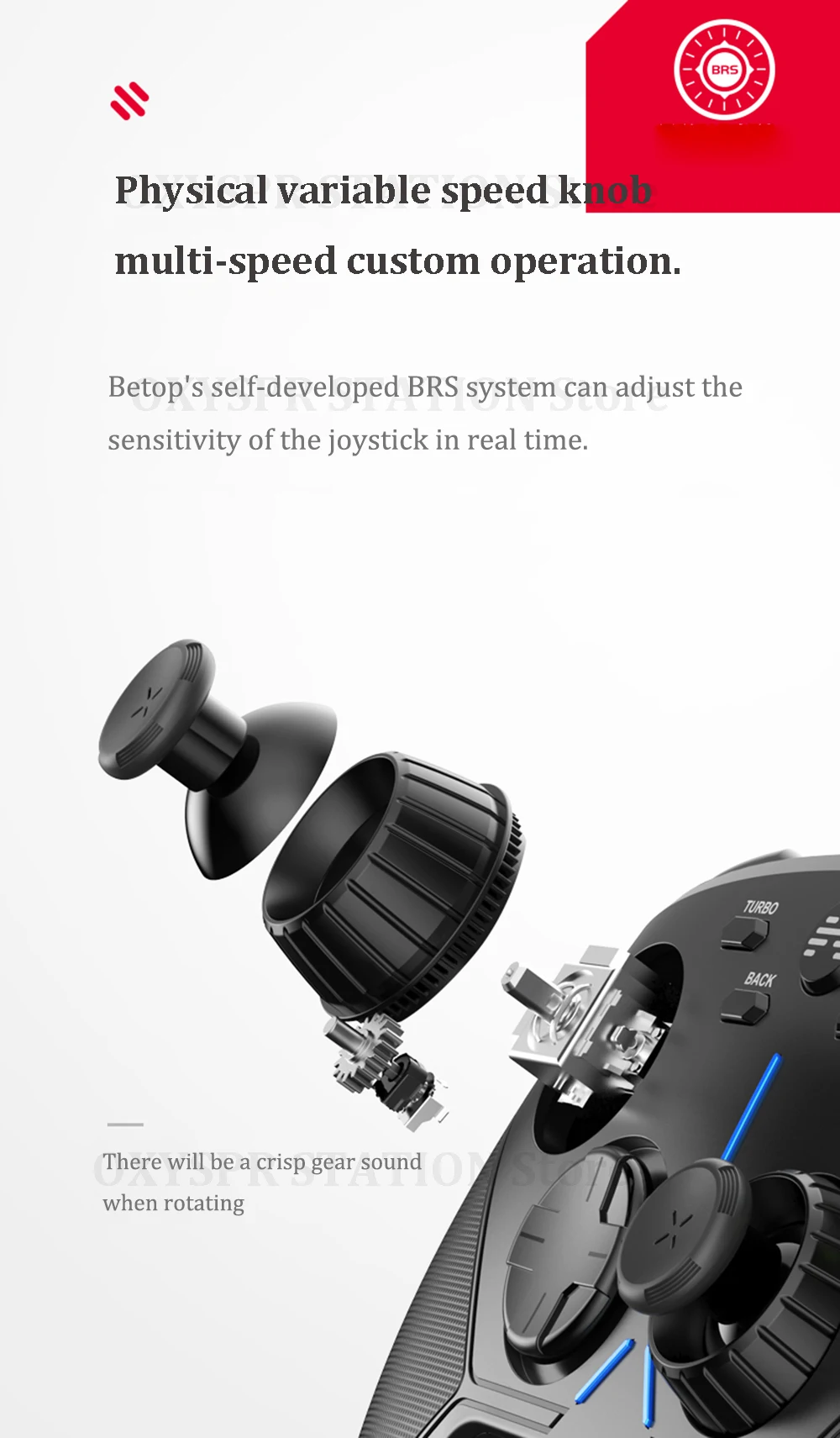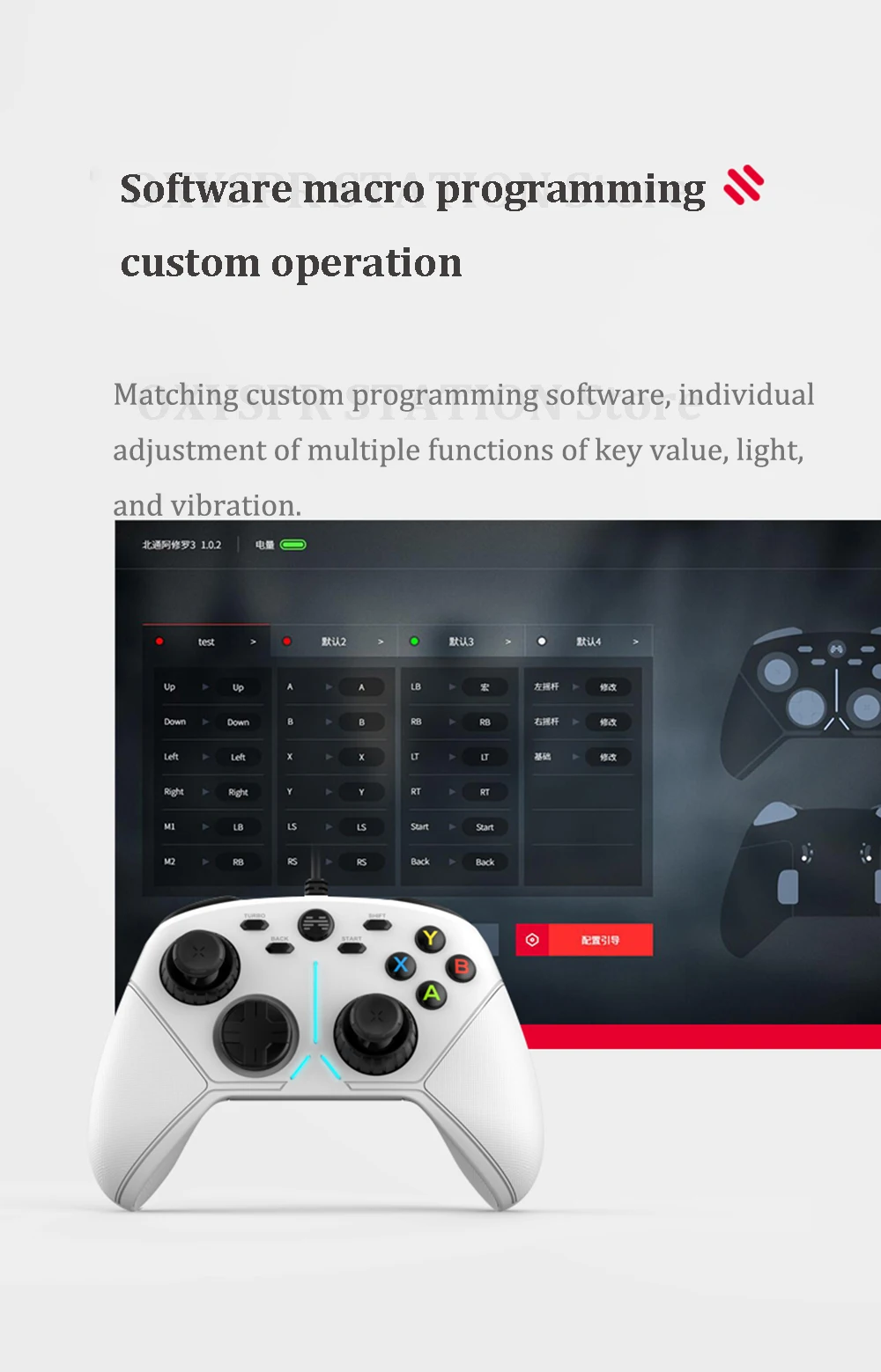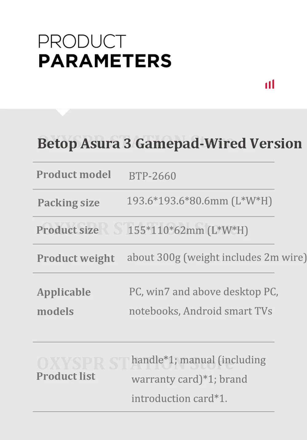 Product parameterProduct Name: Betop Asura 3 Gamepad-Wired VersionProduct model: BTP-2660Packing size: 193.6*193.6*80.6mm (L*W*H)Product size: 155*110*62mm (L*W*H)Product weight: about 300g (weight includes 2m wire)Applicable models: PC, win7 and above desktop computers, notebooks, Android smart TVsProduct list: handle*1; manual (including warranty card)*1; brand introduction card*1. Main features:1,Native adaptation "it takes two"2,A gamepad that supports Tesla in-vehicle games.3,The world’s original rocker sensitivity real-time adjustment button: invention patent 2020105899832 applicable new patent 202011989969.Physical variable speed knob, multi-speed custom operation.Betop's self-developed BRS system can adjust the sensitivity of the joystick in real time.4,Seven major gears to play competitive games: 7-speed physical transmission from red to purple, 3 basic modes are recommended, experience the fine plot of the 3A masterpiece with meticulous operation, and explore more game fun.5,Rocker anti-wear technology, silky feel.6,Mechanical button: 0.7mm trigger stroke, 35% shorter than the traditional button trigger time.7,Three-stage trigger stroke: micro-range is suitable for shooting games; mid-range is suitable for ball games; full-range is suitable for racing games.8,Camel-style cross keys: The eight-way keys are clearly spaced to achieve rapid and continuous triggering of direction changes.9,Software macro programming custom operation: matching custom programming software, individual adjustment of multiple functions of key value, light, and vibration.Double back key design: custom programming back key, double the operating efficiency.Stepped counterweight: You can freely add 7G and 15G counterweight accessories. (The counterweight must be purchased separately)10,TURBO+any action button: realize continuous key operation.SHIFT key: realize the function interchange of the cross key and the left joystick.11,Craftsmanship, meticulous: ergonomics, comfortable to hold the curve; laser drying, skin-friendly and non-slip; metal paint fine matte texture, meticulous hand feeling experience.12,Play popular games: PC/TV/STEAM/emulator/ps3 (soft broken version)